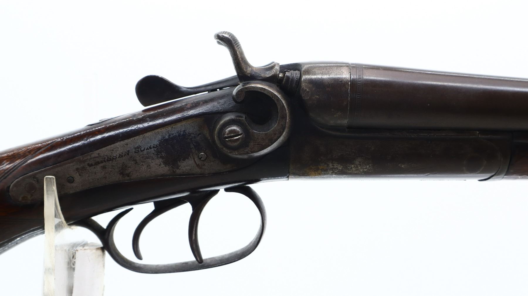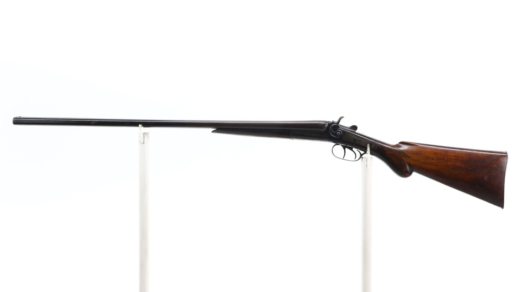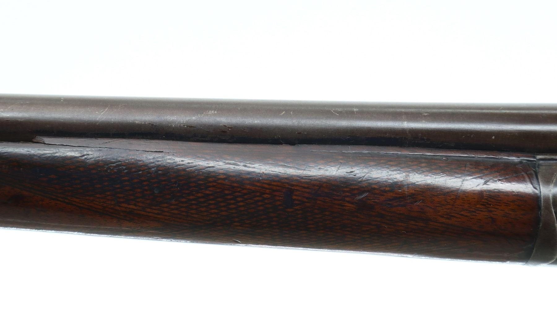 3/10, JANSSEN & SON, MODEL: SIDE BY SIDE HAMMERGUN, CALIBER:20 G X 2 1/2", BORES ARE POOR, PITTED. FIXED CYLINDER CHOKES. BRASS BEAD, LAMINATED STEEL BARRELS LOOSE ON FACE WITH SMALL DENTS, BACK ACTION LOCKS WITH GROOVED SPUR HAMMERS THAT WORK, BOTH ARE LOOSE, EXTRACTOR, DOUBLE TRIGGERS. TWO PIECE WOOD STOCKS, CHECKERED FOREARM, PISTOL GRIP, GROOVED STEEL BUTT PLATE. METAL FINISH TURNING BROWN WITH LIGHT PITTING, RUST SPECKLES, SCRATCHES, HANDLING MARKS AND WEAR. STOCKS SHOW MARKS, SCRATCHES AND WEAR. , ACTION: HINGED SIDE BY SIDE SHOTGUN, BARREL LENGTH: 28.25", SERIAL # 15333, CONDITION: 3/10, CLASS: CANADIAN NON RESTRICTED