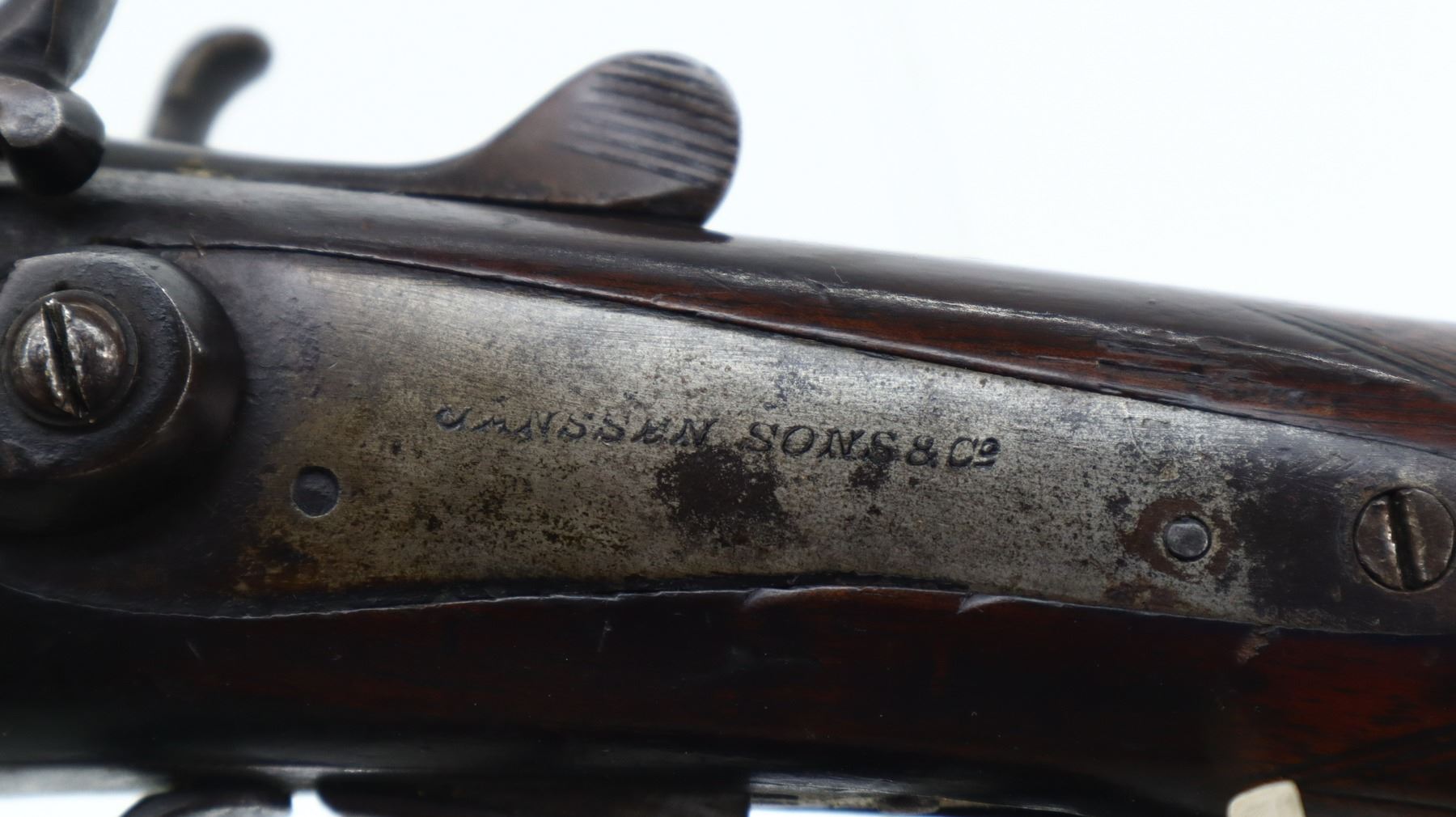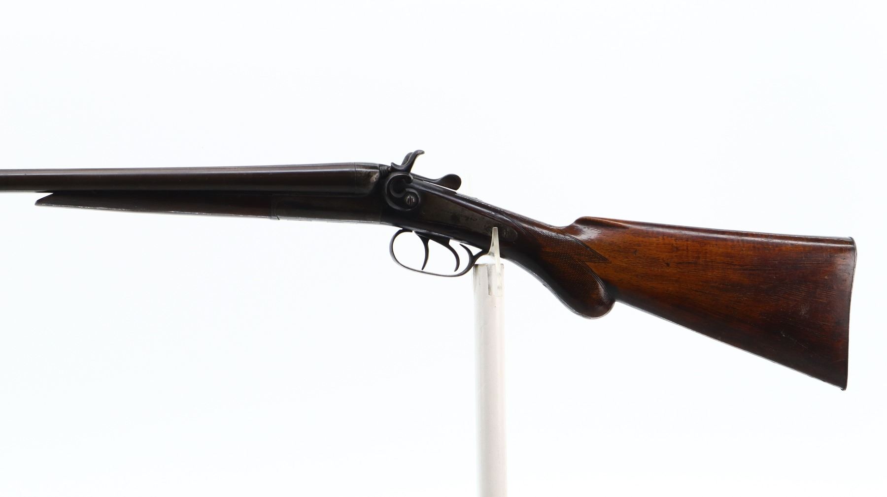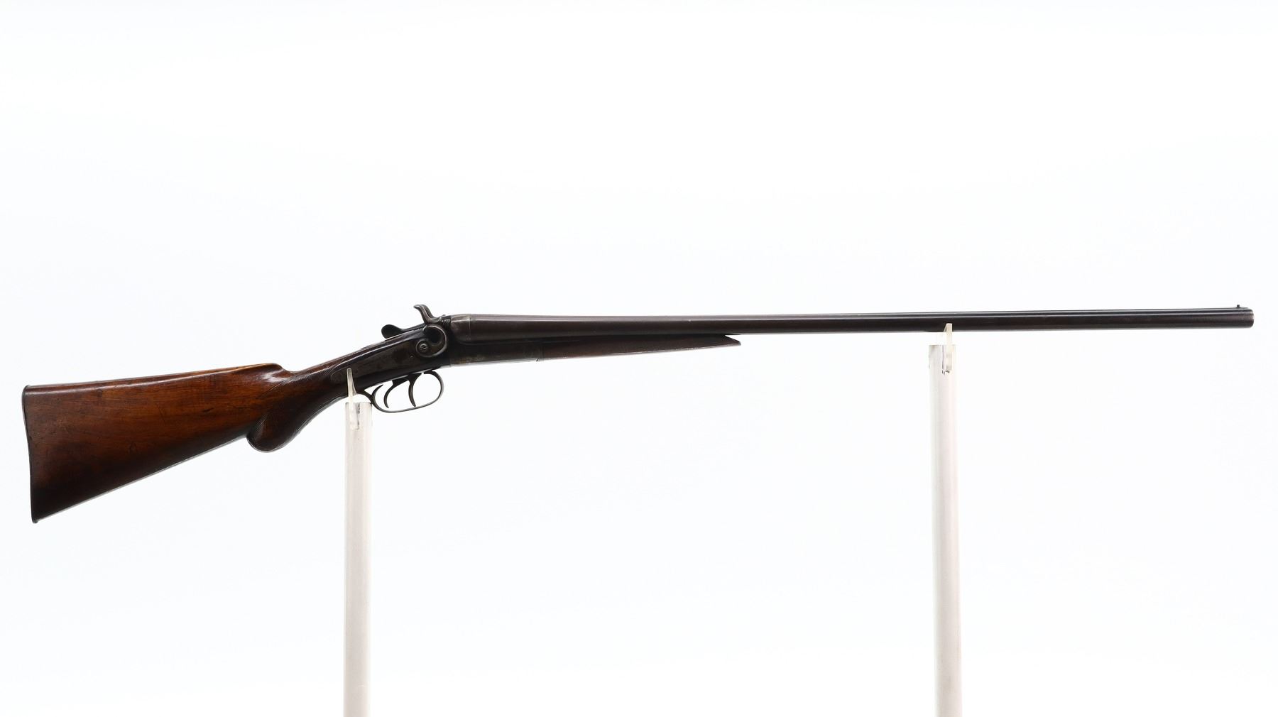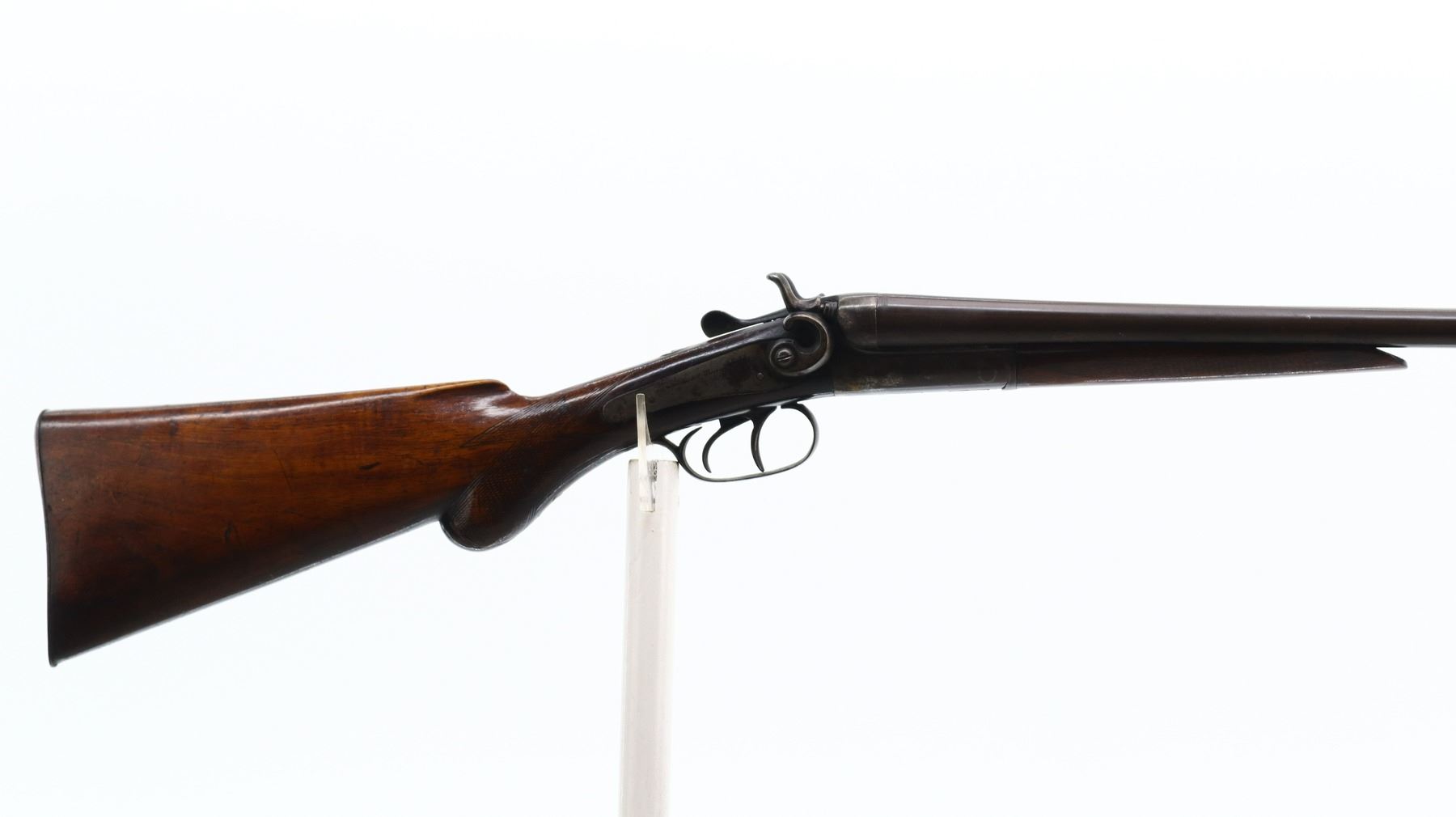 3/10, JANSSEN & SON, MODEL: SIDE BY SIDE HAMMERGUN, CALIBER:20 G X 2 1/2", BORES ARE POOR, PITTED. FIXED CYLINDER CHOKES. BRASS BEAD, LAMINATED STEEL BARRELS LOOSE ON FACE WITH SMALL DENTS, BACK ACTION LOCKS WITH GROOVED SPUR HAMMERS THAT WORK, BOTH ARE LOOSE, EXTRACTOR, DOUBLE TRIGGERS. TWO PIECE WOOD STOCKS, CHECKERED FOREARM, PISTOL GRIP, GROOVED STEEL BUTT PLATE. METAL FINISH TURNING BROWN WITH LIGHT PITTING, RUST SPECKLES, SCRATCHES, HANDLING MARKS AND WEAR. STOCKS SHOW MARKS, SCRATCHES AND WEAR. , ACTION: HINGED SIDE BY SIDE SHOTGUN, BARREL LENGTH: 28.25", SERIAL # 15333, CONDITION: 3/10, CLASS: CANADIAN NON RESTRICTED