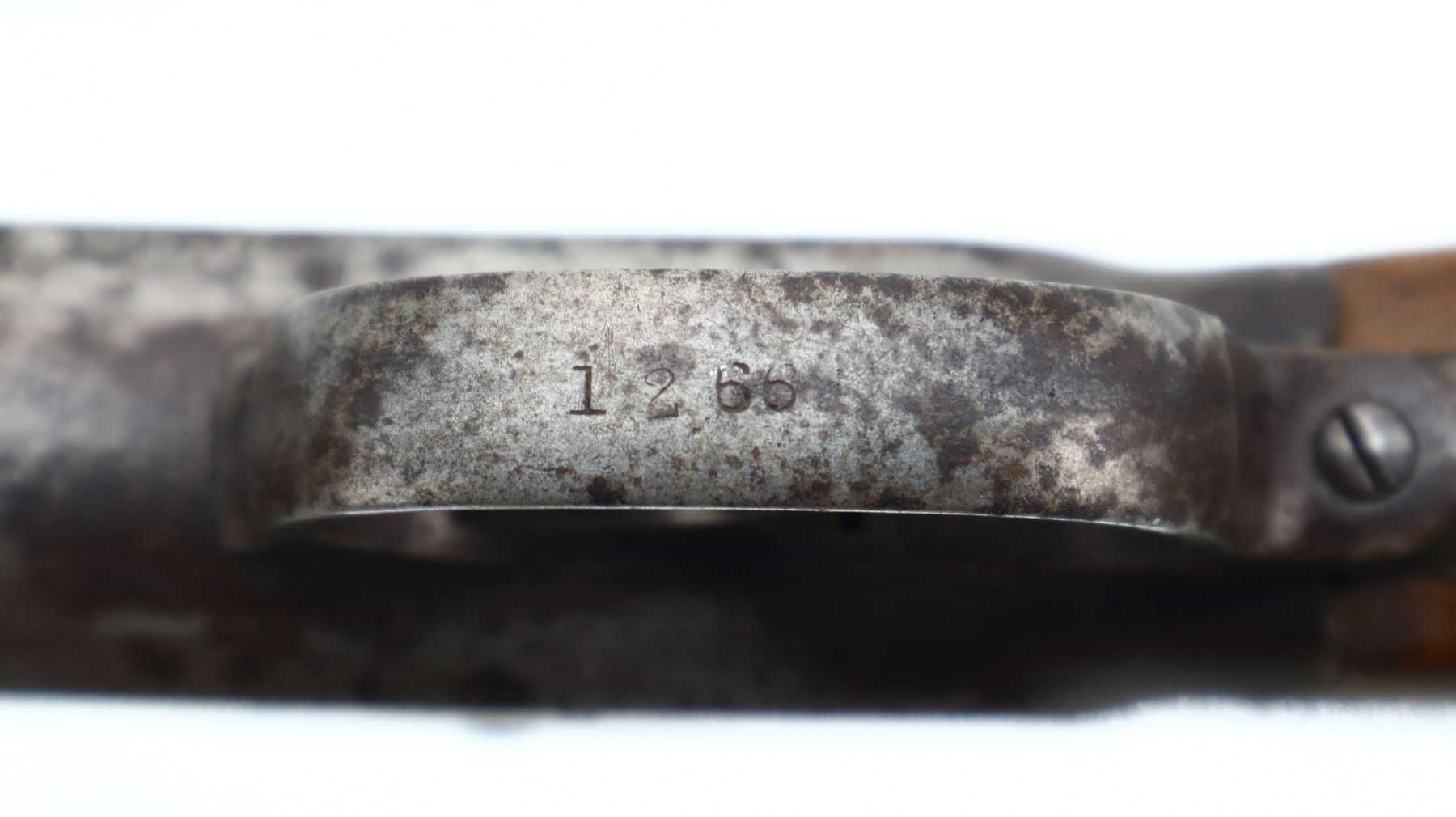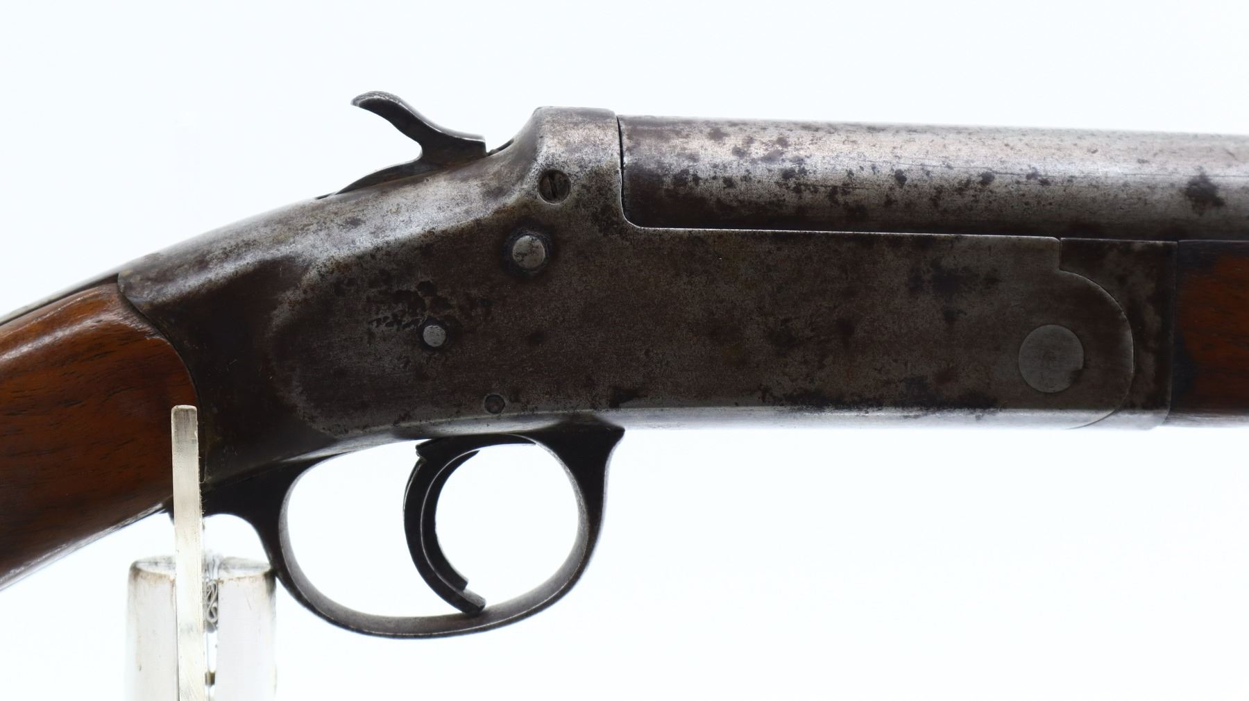 2/10, IVER JOHNSON, MODEL: SINGLE SHOT, CALIBER:12 G X 2 1/2", BORE IS FAIR, PITTED. FIXED IM CHOKE. BRASS BEAD, ROUND BARREL LOOSE ON FACE, CHECKERED SPUR HAMMER, EJECTOR, TRIGGER HAS A BLADE IN THE CENTER IT RELEASES THE HAMMER AND ALSO OPENS THE ACTION WHEN PULLED A SECOND TIME. TWO PIECE SMOOTH WOOD STOCKS, PISTOL GRIP, MISSING BUTT PLATE, STOCK CHIPPED, GRIP CAP. METAL FINISH TURNING BROWN, SILVER GREY WITH PITTING, RUST, HANDLING MARKS AND WEAR. STOCKS SHOW SMALL CRACKS, HANDLING MARKS AND WEAR. , ACTION: HINGED SINGLE SHOT SHOTGUN, BARREL LENGTH: 30", SERIAL # 1266, CONDITION: 2/10, CLASS: CANADIAN NON RESTRICTED
