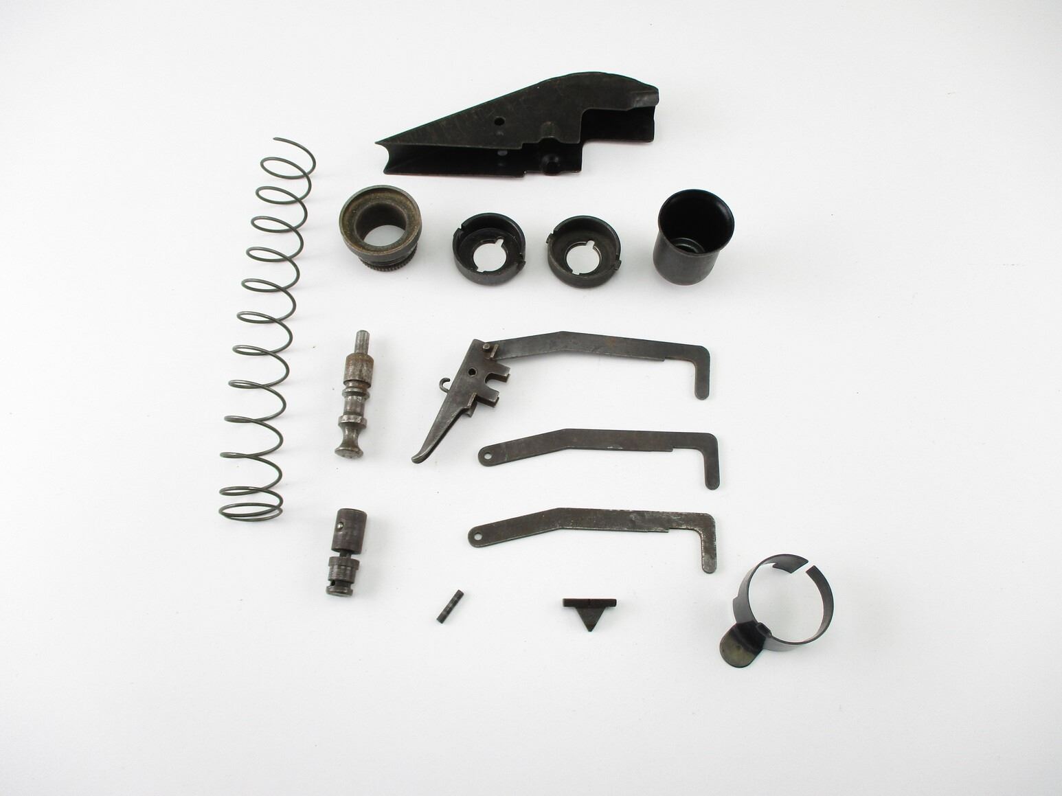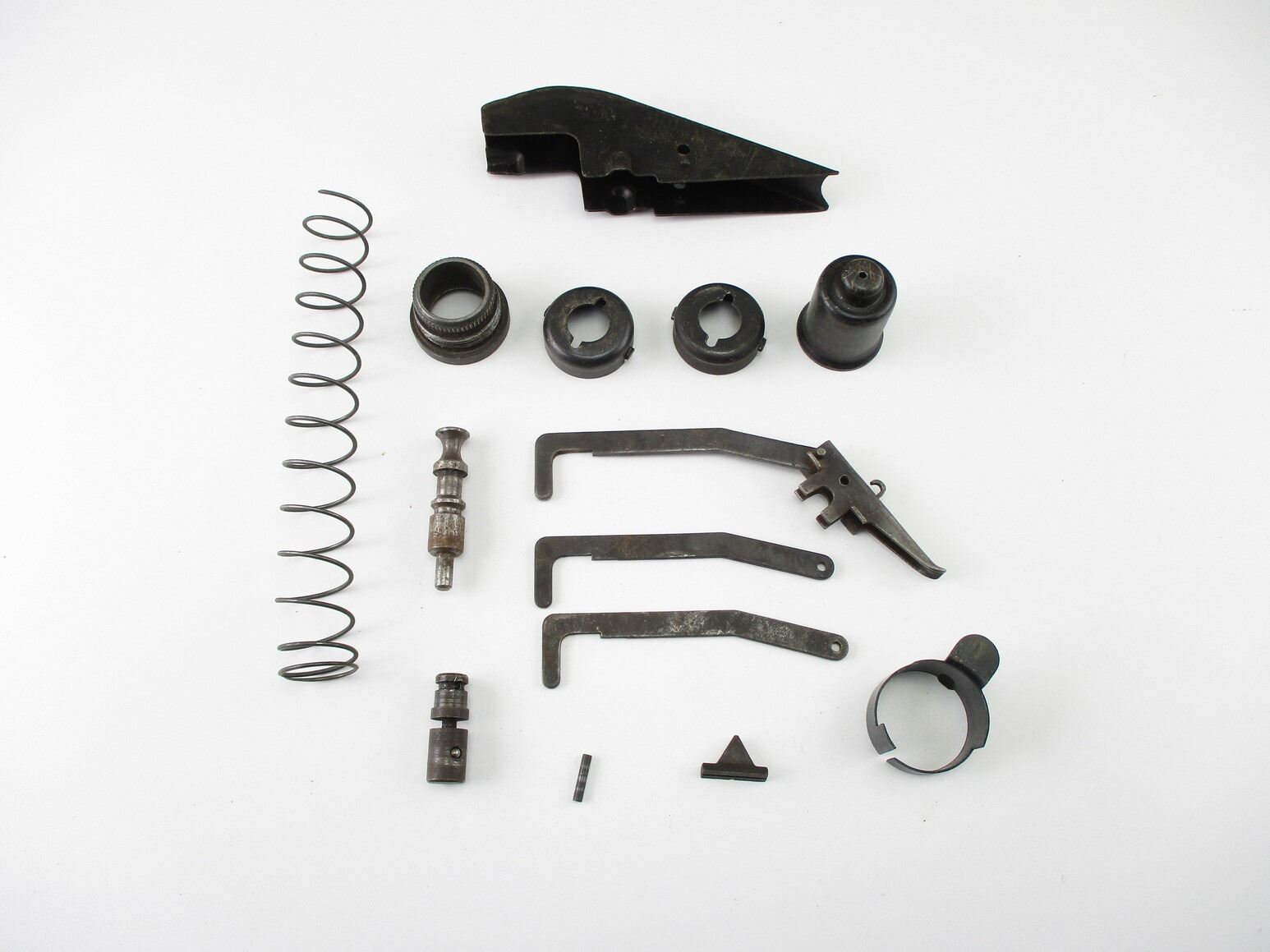 WW.II STEN 9MM SMG PARTS, FITS MK.II MODELS, INCLUDES: DISCONNECTORS, TRIGGER SAFETY, COCKING HANDLE, FRONT SIGHT, FINGER STOP, RECOIL SPRING RETAINERS, TRIGGER HOUSING COVER, ETC.