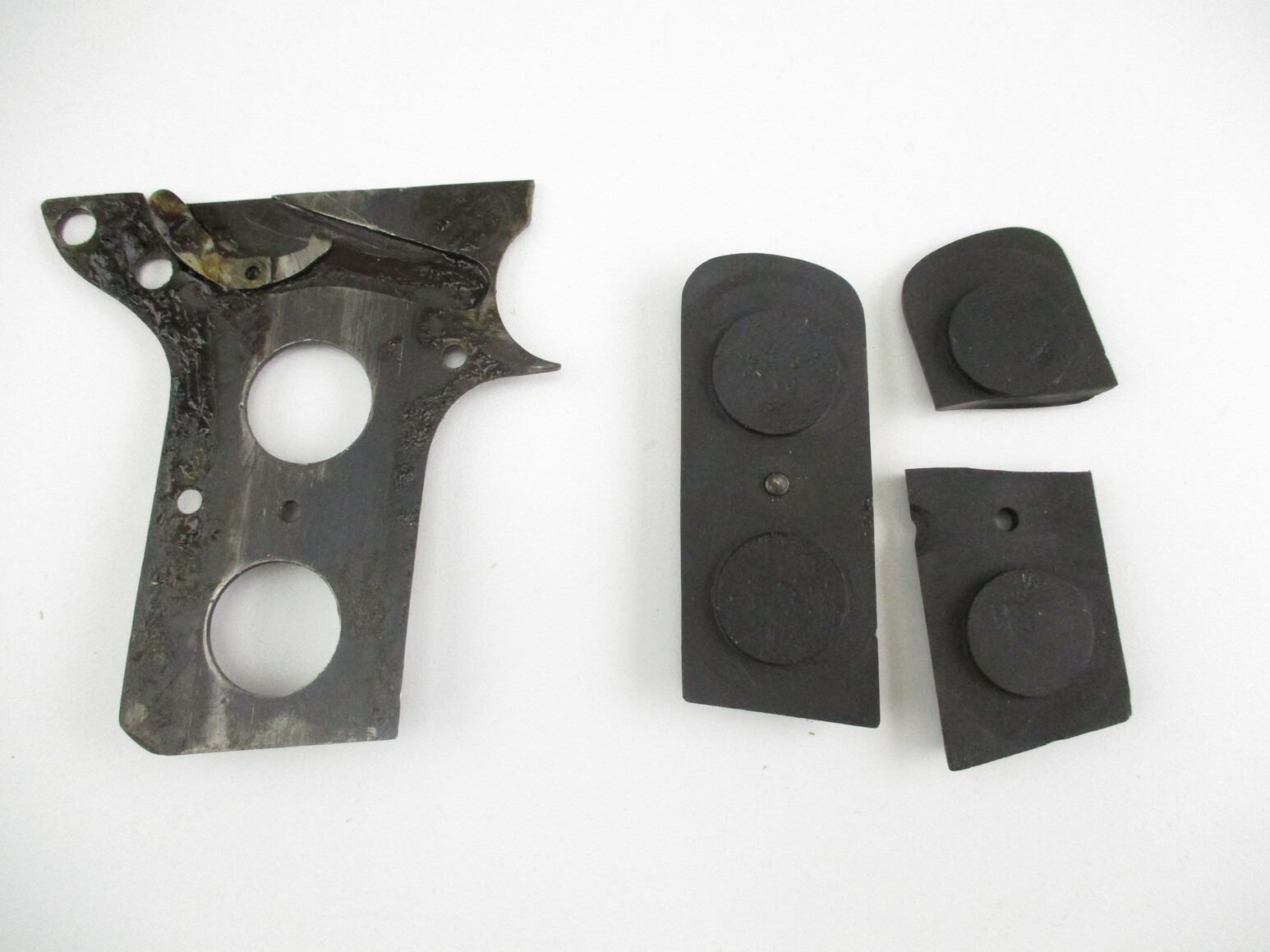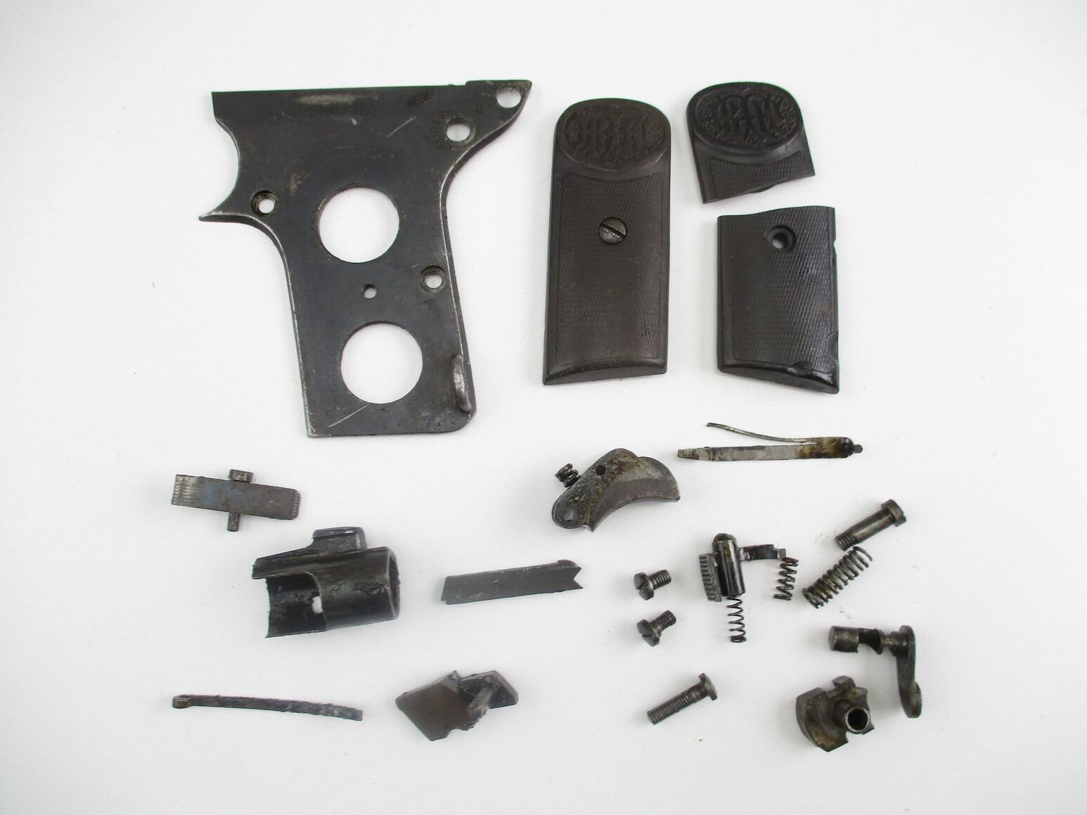 DREYSE 1907 PISTOL PARTS , INCLUDES: SIDE PLATE, SAFETY CATCH, TRIGGER, PISTOL GRIPS (NOTE: LEFT SIDE GRIP IS BROKEN), BOLT HEAD, SAFETY CATCH SPRING, ETC. PARTS MAY REQUIRE FITTING.