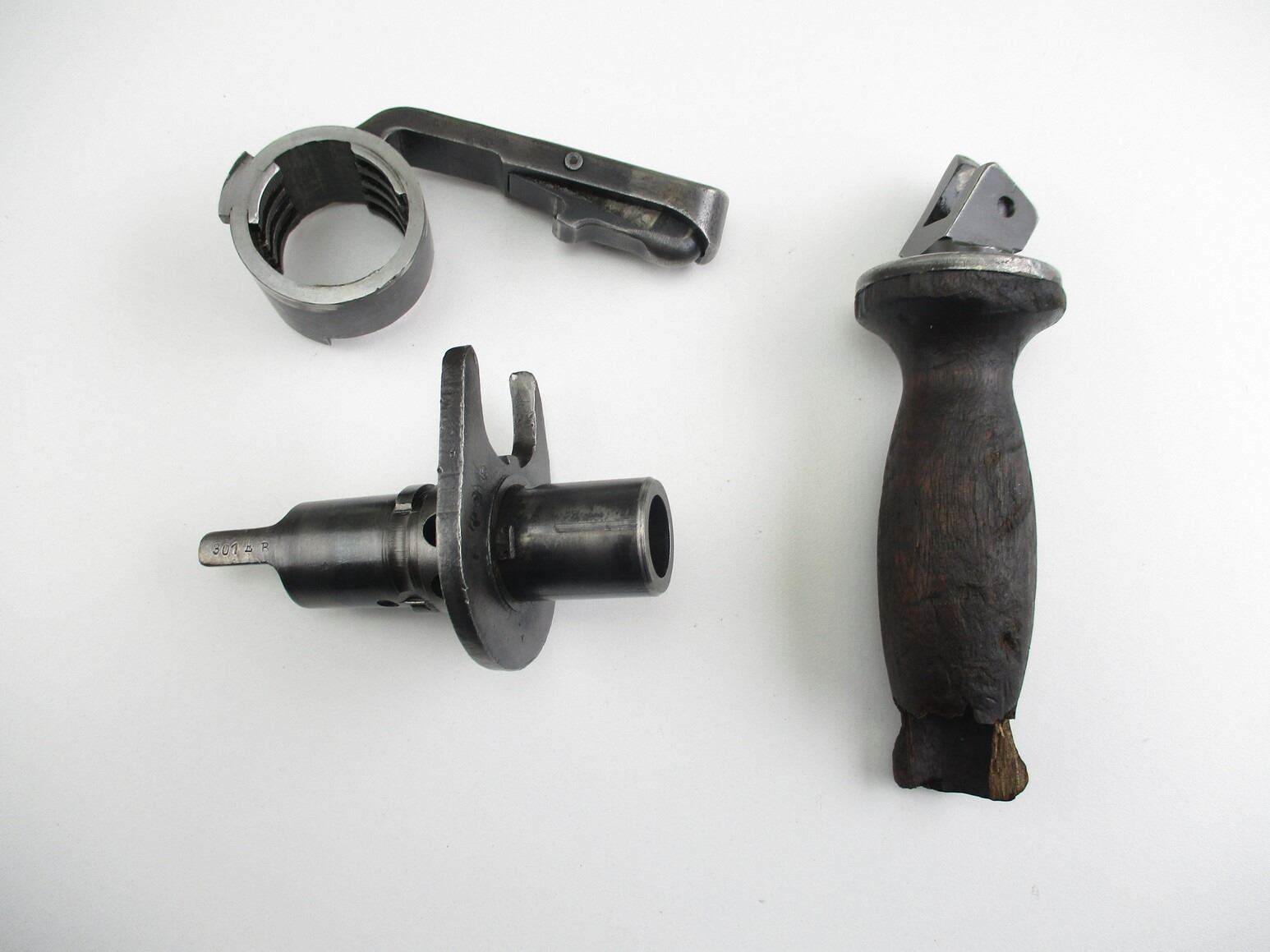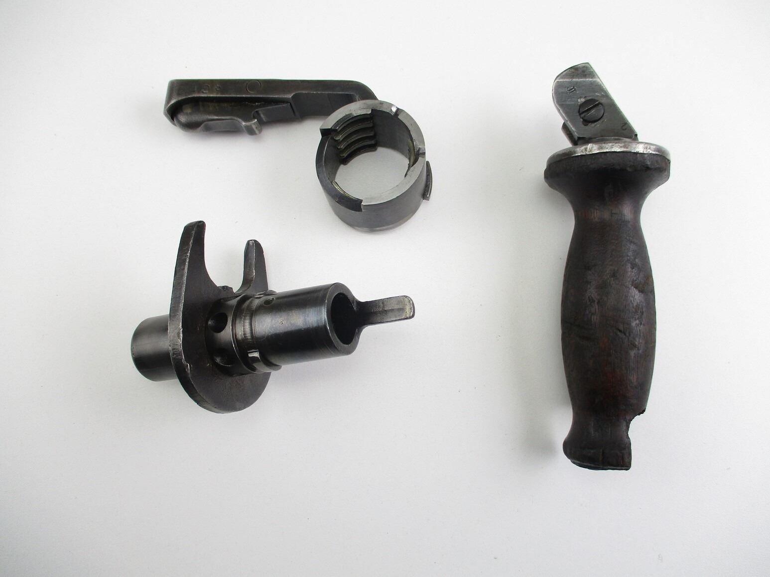 ASSORTED CANADIAN BREN MG PARTS , INCLUDES: (1) BREN BARREL LOCKING HANDLE, MARKED 8CI D 242, WITH OTHER MARKINGS, (1) BREN BARREL CARRY HANDLE, "JI" MARKED, WOOD APPEARS DAMAGED, (1) MK.1 BREN GAS CYLINDER, "JI" MARKED. MAY REQUIRE FITTING.