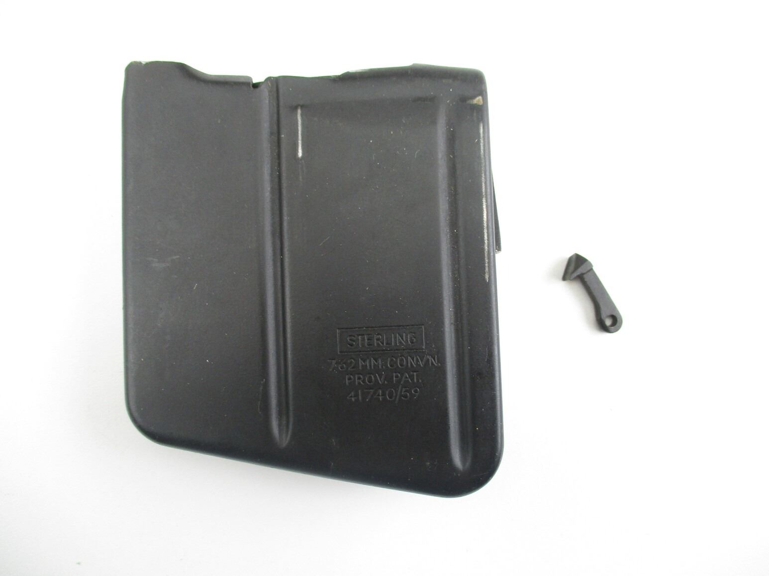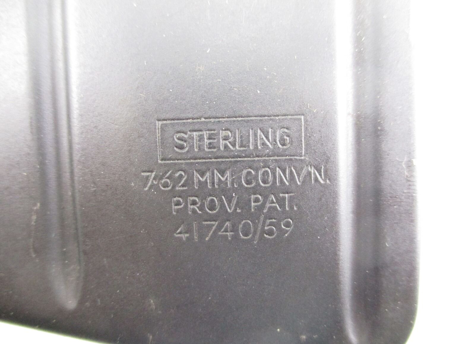 RARE STERLING 7.62N LEE ENFIELD MAGAZINE , 7.62N, 10 ROUND MAG, FITS NO.4 RIFLES, MARKED STERLING, 7.62MM, CONN, PROV, PAT. 41740/59. INCLUDES EXTRACTOR FOR NO.4 RIFLES.