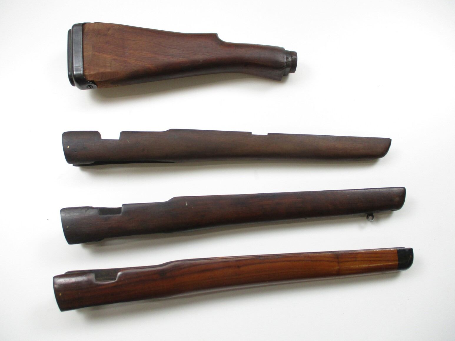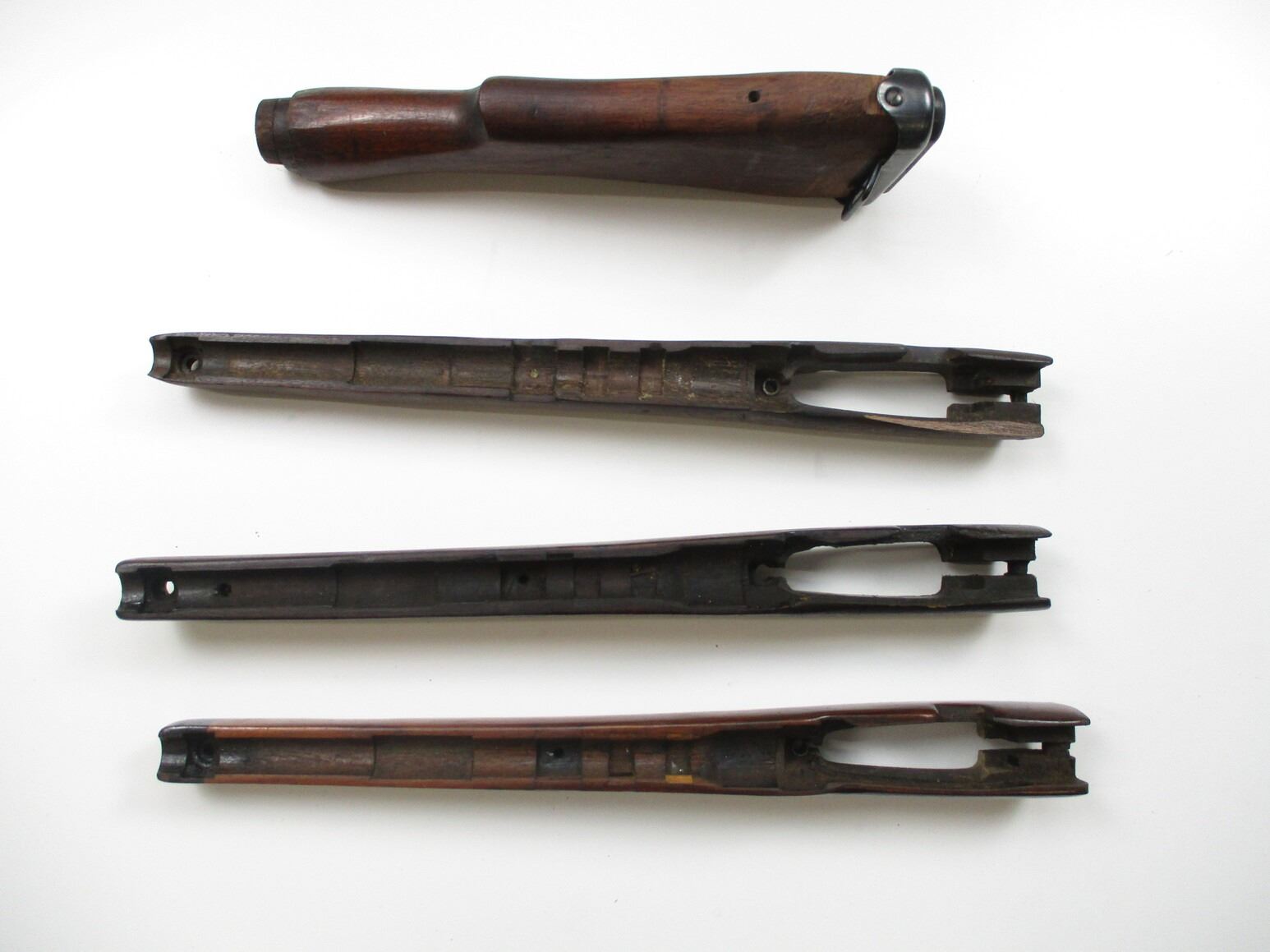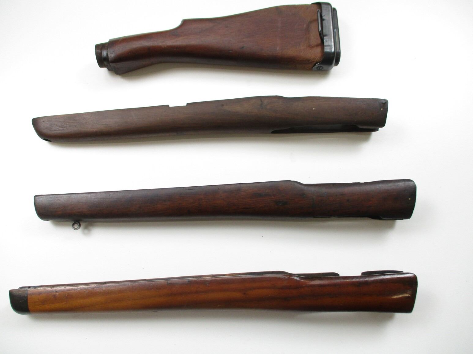 LEE ENFIELD SPORTER STYLE FORENDS & BUTT SOCKS , (1) LEE ENFIELD BUTT STOCK, MODIFIED TO FIT NO.5 JUNGLE CARBINE BUTT PLATE, APPEARS UNMARKED, (3) SPORTER FORENDS, POSSIBLY NO.1 MK.3 FORENDS, CUT OUTS FOR REAR SIGHTS, 1 WITH STOCKS MAY HAVE STUFFS, MARKED & OR CRACKS IN WOOD, NO VISIBLE MARKINGS ON FORENDS, MAY REQUIRE REPAIR & FITTING.