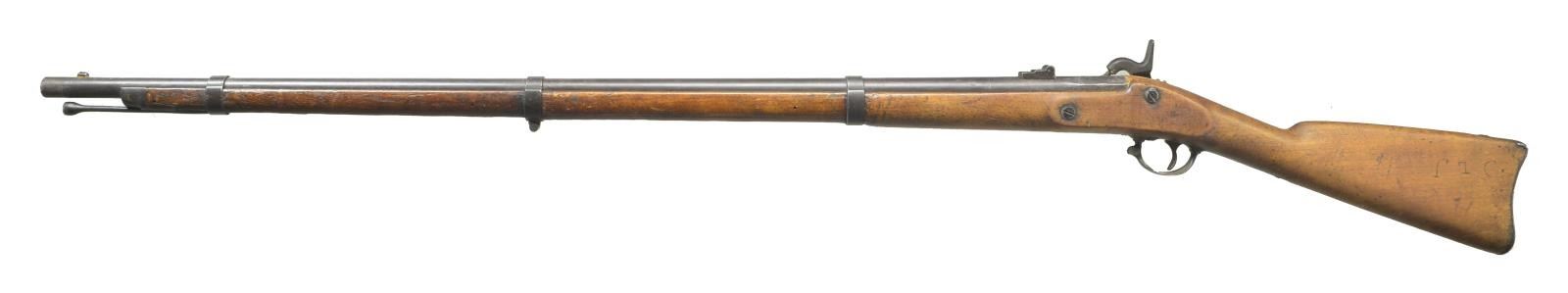 DATED LOCK. Cal. 58. NSN. Standard configuration with 40" bbl. held by three spring retained bands. Three leaf sight is mounted toward rear. No date found on bbl. 1862 Type percussion lock with eagle and U.S. Springfield markings is dated “1862” on tail. Walnut stock extends to within 4" of muzzle with steel cap and is iron mounted. Left side of butt is carved with initials “LJ” and “C”. CONDITION: poor. Metal parts with dark brown to black patina over considerable scattered pitting. Sight leaf is rusted into place. Rear portion of bbl. with heavy pitting. Breech plug squashed. Stock is good with old cleaned surface and plastic wood infill around bbl. tang. There is a crack from front of lock upward toward bbl. for about 4". Dark rusted bore has rifling barely evident. Lock is weak. Sling loops are missing. (01-21512/MGM). ANTIQUE. $600-800.