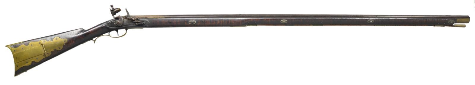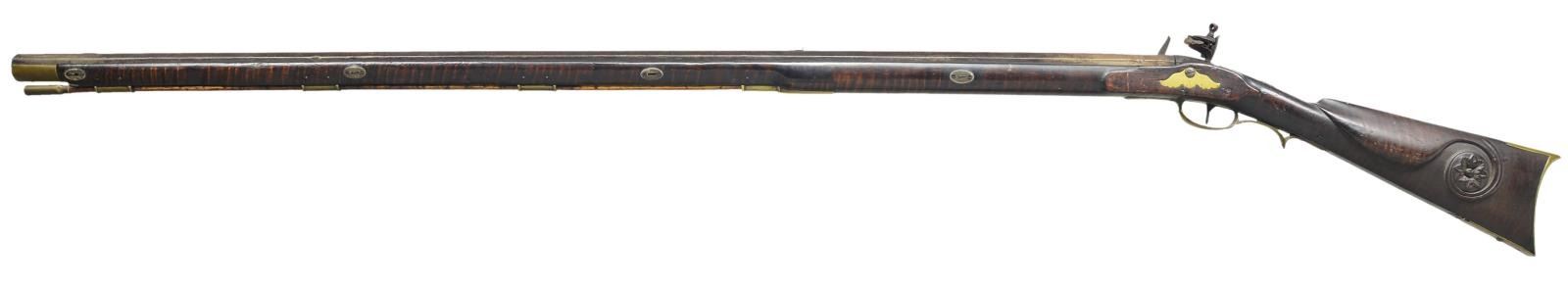 STYLE RIFLE. Cal. 50. Bbl 45” octagon with German silver blade front sight, fixed iron V notch rear sight, German silver manufacture marking, & two silver bands just forward of touch hole attached to the stock with four keys through German silver escutcheons. Attractive striped walnut stock with brass furniture & relief carved cheek rest flowing into a floral embellishment. CONDITION: overall very good with a balanced Bbl patina. Overall good stock with scattered handling marks & mild impressions. An overall attractive rifle. (01-21766/ZAL). ANTIQUE. $700-1200