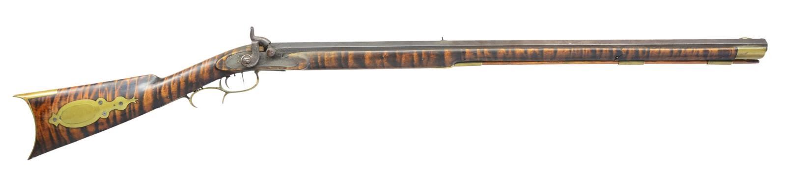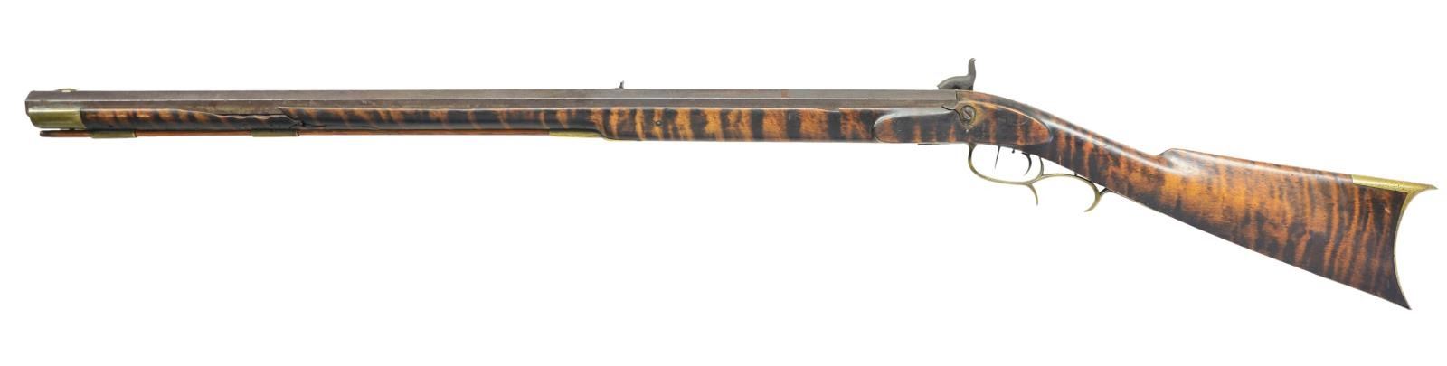 Cal. 34. S# NSN. Bbl. 30' heavy non tapered octagon (1" across flats) with low profile brass blade front and semi-buckhorn fixed rear. Mfg. 1844-1847 in Pittsburgh, PA; (Craig was born in England) moved to CA in 1857 and back to PA in 1860. Craig had many notable gunsmiths that worked for him at both locations. Fiddleback maple stock having brass for triggerguard, ramrod tubes, patchbox and buttplate. Double set triggers. Top of barrel marked "Wm. Craig" over "Pittsburgh" (g is faint and h not visible). Lock markings in oval form barely visible; "ELL" showing on end of top plus "WARRANTED" on bottom. CONDITION: fair overall with stock damage to include break by mid ramrod tube, crack on left side opposite lock, replacement wood behind bolster plus some chips; most notable on left by mid ramrod tube. Poor bore with oxidation; distinct rifling. (01-21663/NW). ANTIQUE. $400-600.