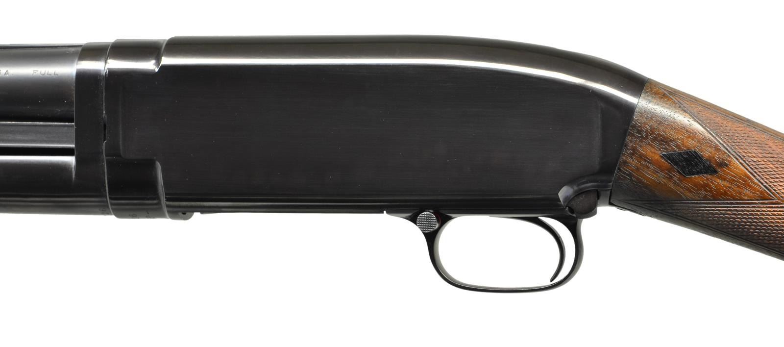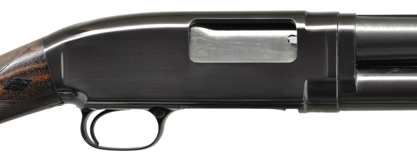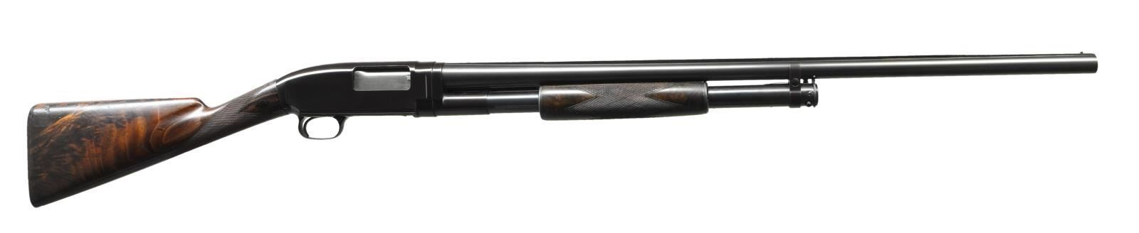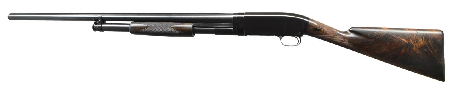 PUMP SHOTGUN. Cal. 12 Ga. S# 139326. Bbl. 28" of nickel steel w/ solid rib & fixed full choke. Steel front bead w/ filled hole for mid bead. Sm. rnd. forearm & straight grip stock of fancy walnut w/ trap grade wraparound hand checkering. Wrist of stock has black diamonds on each side. LOP: shortened to 13 1/2" over reattached buttplate. Mfg. 1917. CONDITION: 97% finely executed reblued metal finish. Refinished wood has freshened checkering. Toeline of stock has 4 plastic wood filled holes, apparently for added pistol grip attachment. Hammer will drop before bolt is closed & must be repaired to be safe. Bbl. takeup ring has all notches used. Very good bright bore. (21-2372/DS). CURIO. $650-1,000.