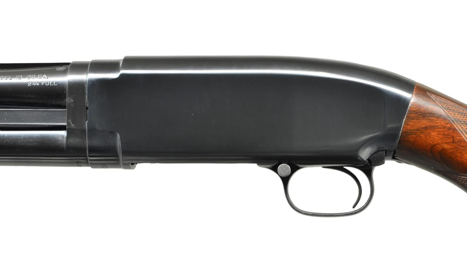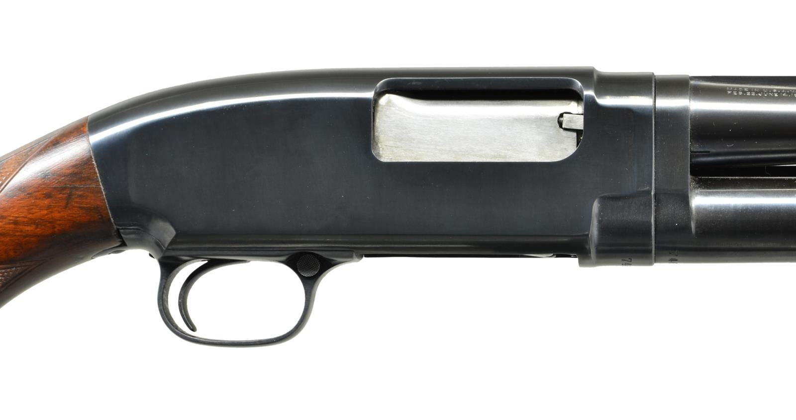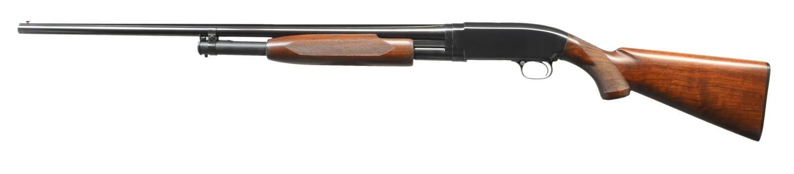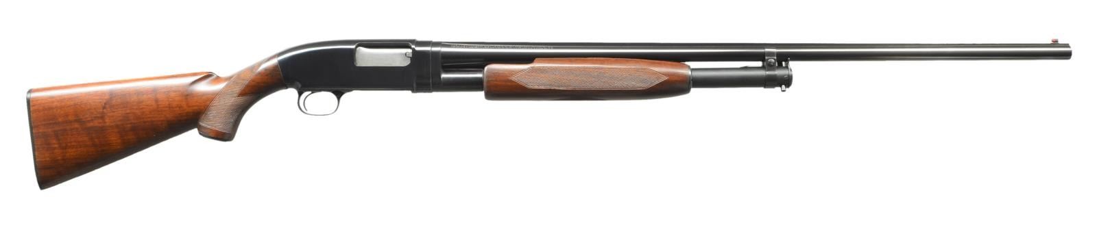 Cal. 20 Ga., 2 3/4". S# 746409. Bbl. 28" solid rib w/ fixed full choke. Red target front sight w/ steel mid bead. Winchester beavertail checkered walnut forearm. Field style stock is reshaped to target configuration w/ added plastic grip cap & hand checkering. LOP: shortened to 12 3/4" over replacement buttplate. Mfg. 1937. CONDITION: over 97% reblued metal finish. Wood has good refinish. Receiver extension is numbered to action. Takedown is stiff. Hammer will drop before bolt is closed & must be repaired to be safe. Very good bright bore. (21-2133/DS). CURIO. $600-900.