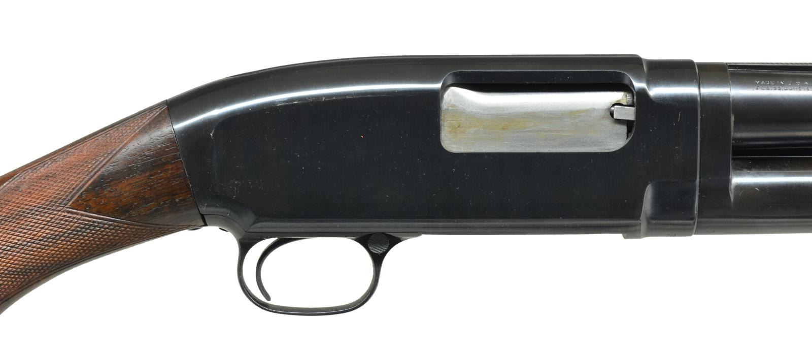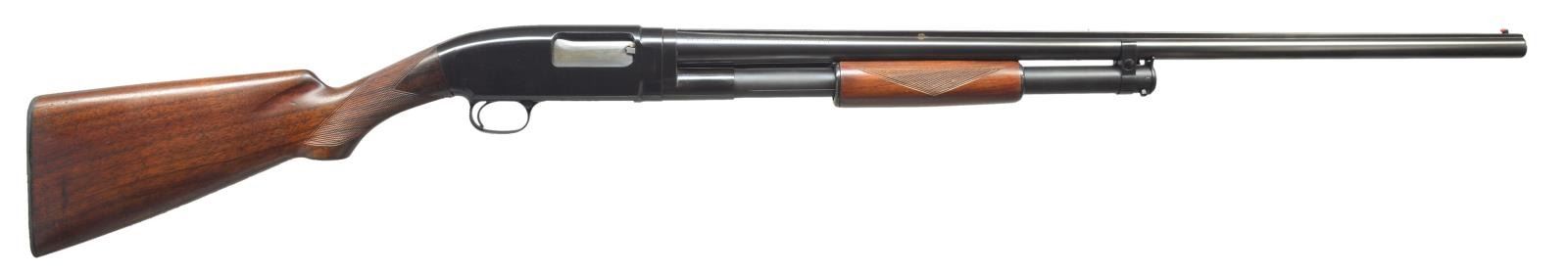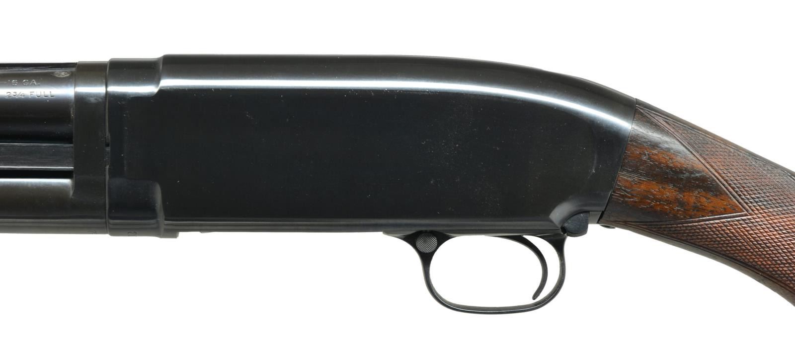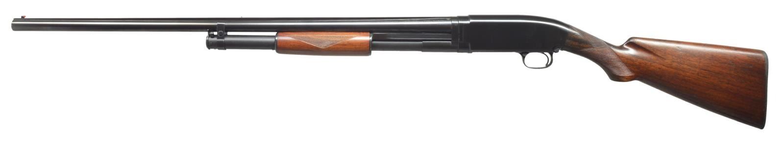 Cal. 16 Ga., 2 3/4". S# 756332. Bbl. 28" of Winchester Proof Steel w/ solid rib. Fixed Full choke. Red target front sight w/ steel mid bead. Replacement sm. rnd. walnut forearm w/ Tournament style 2 panel checkering. Early style pistol grip walnut stock has added Tournament style checkering. LOP 13 1/2" over repro. buttplate. 1936 Mfg. CONDITION: metal retains over 98% reblued finish showing spots of finish around rib. Stock & forearm have good finish showing scratches & marks. Very good bore. (21-2235/DS). CURIO. $400-600.