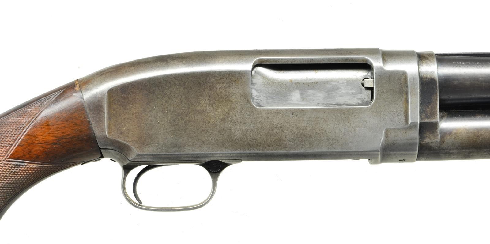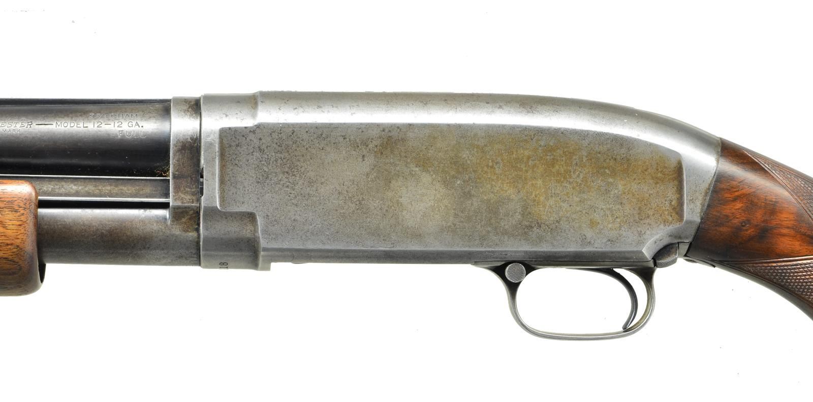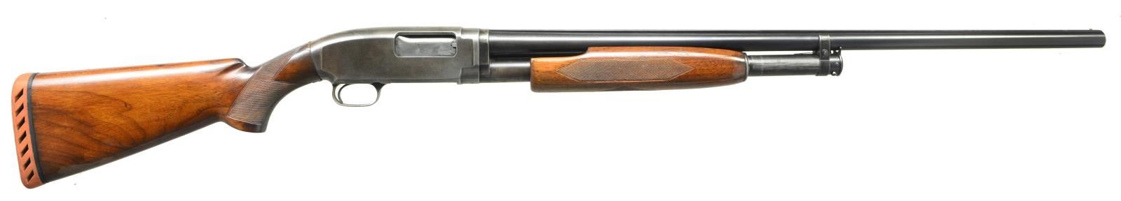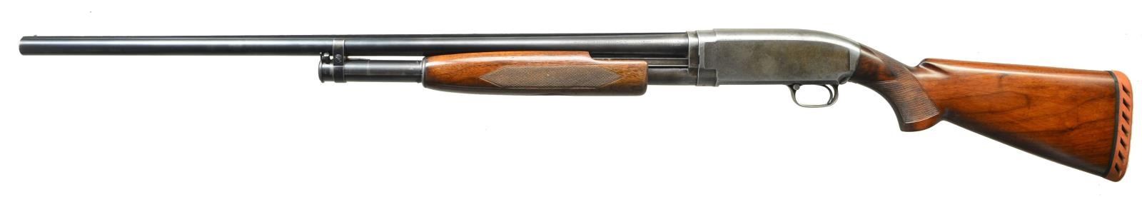 Cal. 12 Ga., 2-3/4". S# 798418. Bbl. 30" of Winchester Proof Steel w/ solid rib, fixed Full choke & steel bead. Beavertail forend & uncapped pistol grip walnut stock have trap grade checkering. LOP. 14" over a Jostam replacement pad. Mfg. 1939. CONDITION: bbl. & mag. tube have 70% lightly faded blue. Action is fading to gray. Forend has worn & peeling original finish. Refinished stock has freshened checkering. Sound action, 2 notches are taken on adjustment ring. Very good bright bore. (21-2274/DS). CURIO. $600-800.