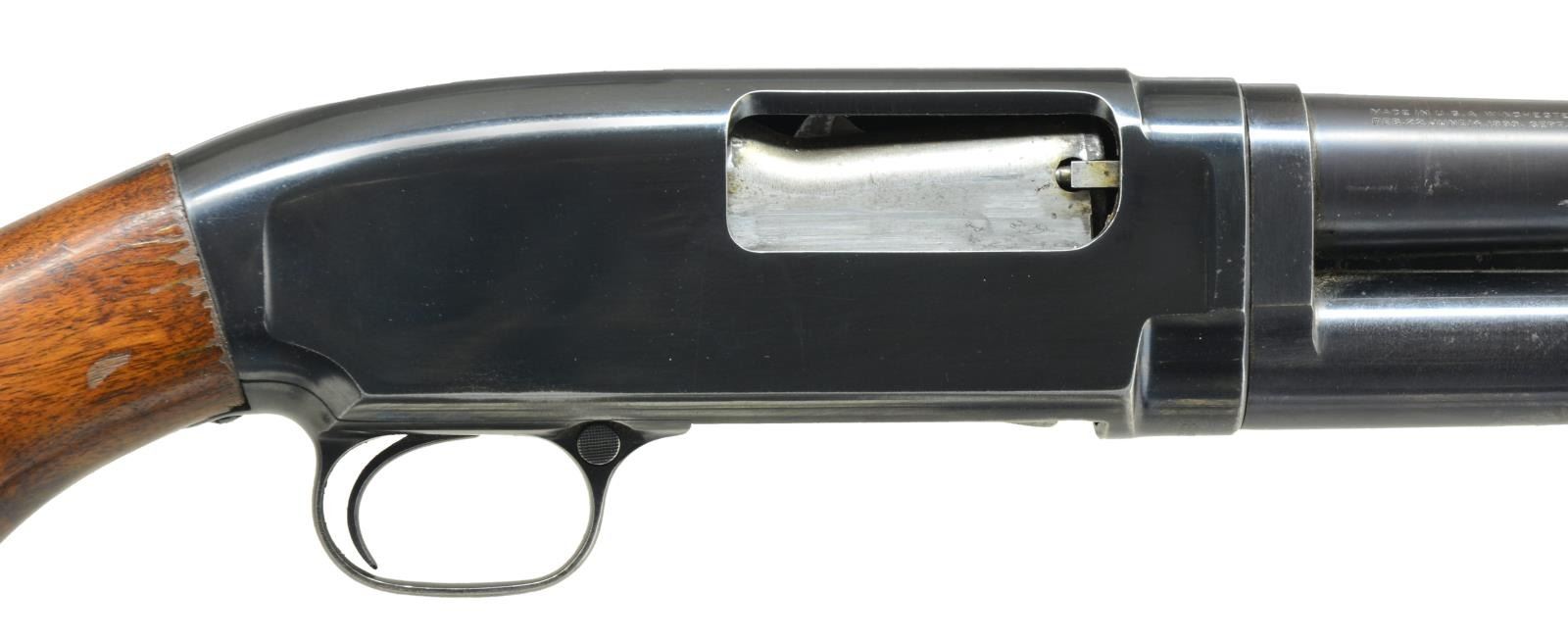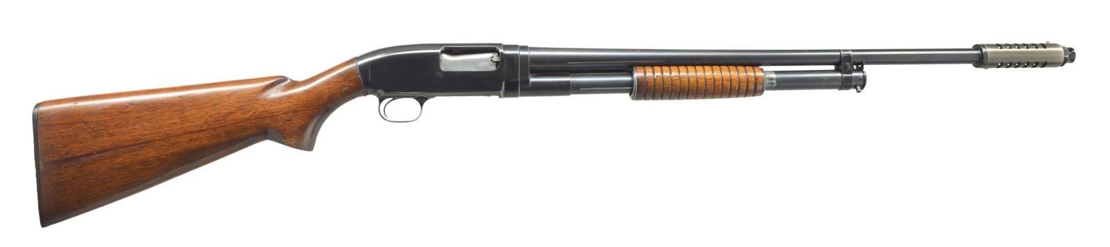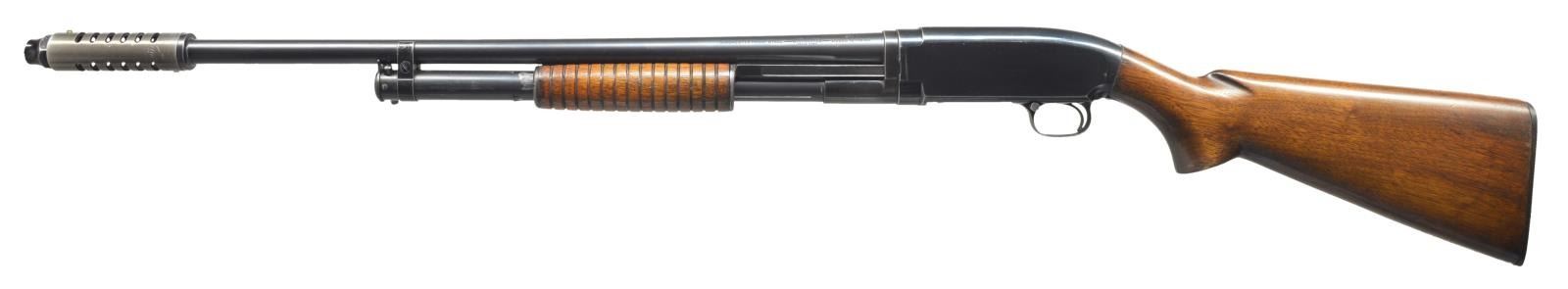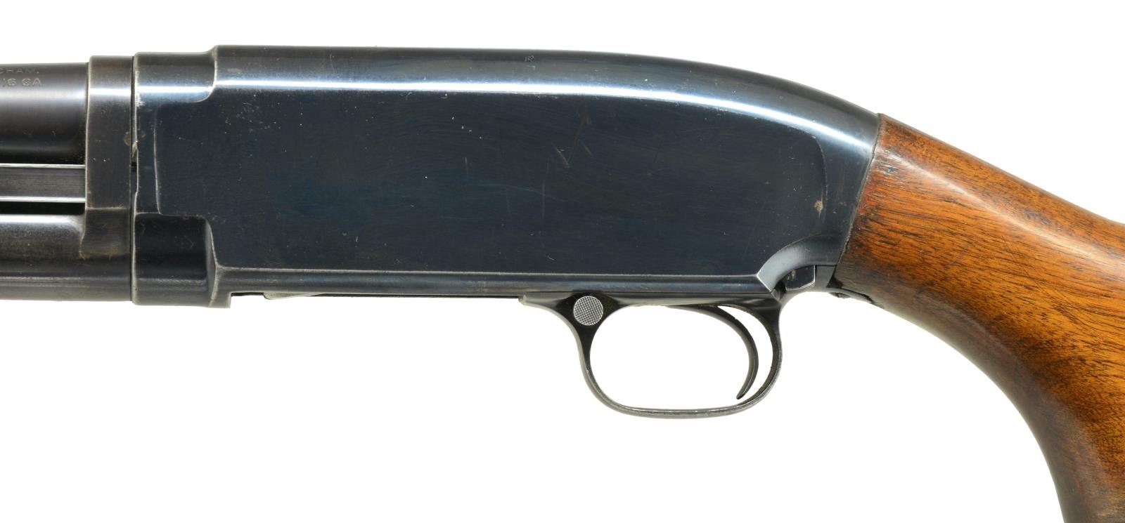Cal. 16 Ga., 2 3/4". S# 850990. Bbl. plain, 26" over factory installed Cutt's w/ spreader tube (no factory choke marking). Steel bead. sm. rnd. grooved forearm & pistol grip stock. LOP: 14" over replacement buttplate. 1940 Mfg. CONDITION: over 80% blue showing slide & edge wear. Refinished forearm shows scratches & sm. marks. Stock finish shows spots of wear w/ scattered scratches & marks around trigger guard tang. Good bright bore. (21-2427/DS). CURIO. $500-750.
