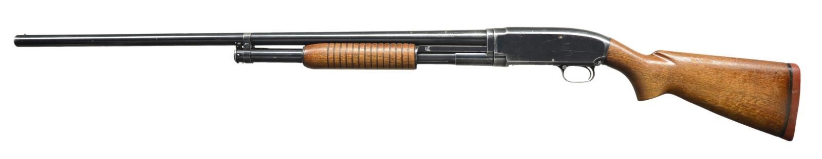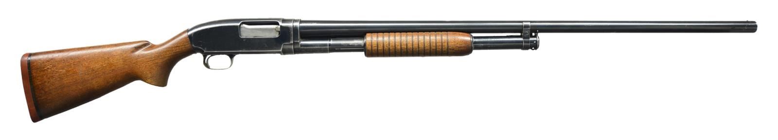 Cal. 12 Ga., 3". S# 1074125 (1947). Bbl. 32" plain w/ bright bead & fixed Full choke. Walnut stock set w/ grooved flat bottom forearm & red Winchester pad. CONDITION: Good reblued metal finish w/ wear, scratches, & peppery oxidation. Good wood finish is peeling w/ numerous handling marks. Mag. tube pin installed improperly. Very good shiny bore w/ light fouling. (22-5274/MD). CURIO. $200-350.