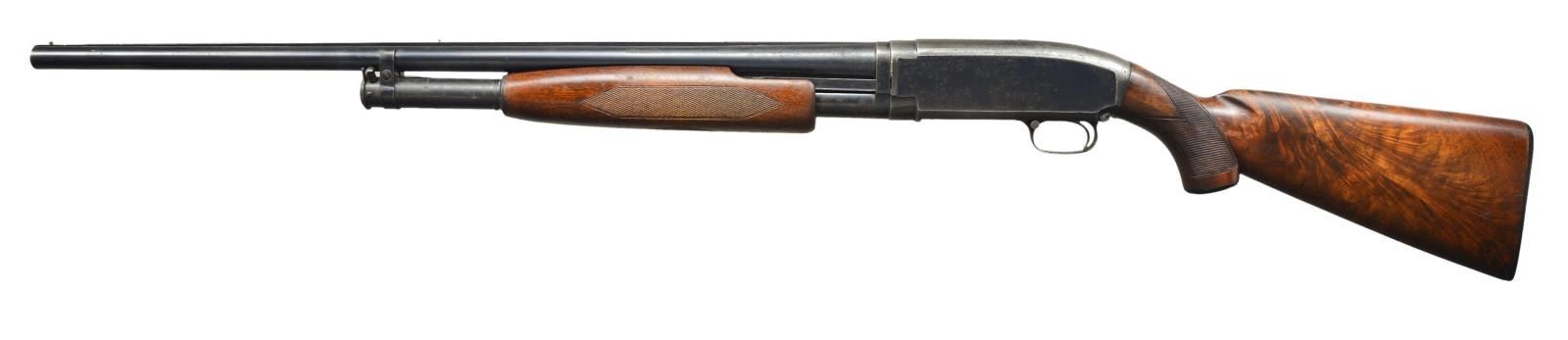 Cal. 12 Ga. 2 3/4". S# 1123286. Bbl. is 28' with solid rib having front and mid silver beads: marked "FULL" choke. Mfg. 1948 WITH 3 panel checkered extension forend plus matching, nicely figured, checkered buttstock having factory grip cap and buttplate; standard 14" LOP. CONDITION: good overall appearance that appears to be original finish yet barrel extension is not numbered. Considerable peppery to light oxidation throughout being most noticeable on receiver. Very good forend; buttstock with light marks plus crack on right side behind receiver. Missing 1 magazine cap screw. Near excellent bore. (22-3683/NW). CURIO. $300-450.