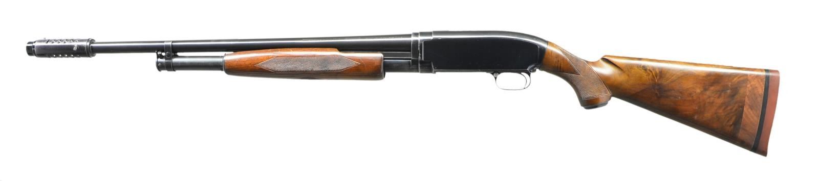 Cal. 12 Ga., 2 3/4". S# 1498152. Bbl. 26" plain over factory installed aluminum body Cutts compensator & spreader tube. Bbl. has integral flange for Cutts & no choke marking. Factory beavertail forearm & steel capped pistol grip stock of fancy walnut w/ skeet checkering. LOP: altered to 13 3/4" over a reproduction solid red pad & 7/8" wood spacer. Mfg. 1955. CONDITION: 75% blue showing slide & carry wear w/ sm. dents at breech end of bbl. & bottom of extension. Sound action. Good bright bore. (21-2434/DS). CURIO. $500-800.