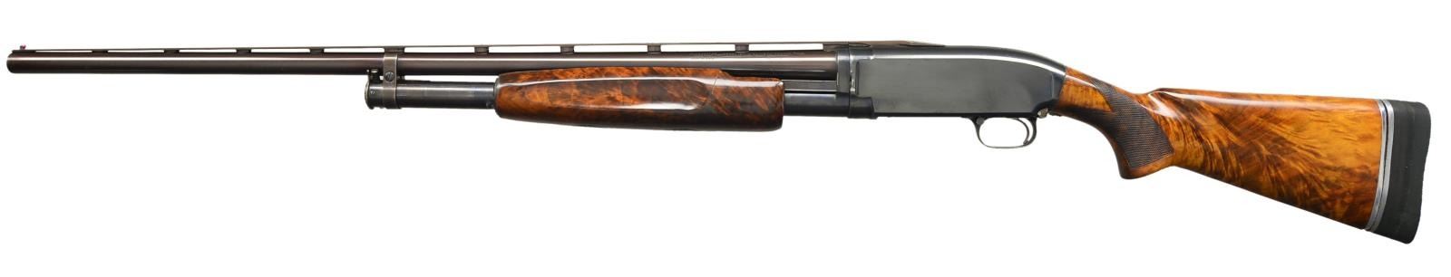 Cal. 12 Ga. 2 3/4". S# 1502083. Bbl. is VR 30" Full choked with red front bead & white mid. Mfg. 1955 having finger grooved 2 panel checkered highly figured extension forend plus highly figured checkered replacement buttstock w/ adjustable aluminum buttplate having black Kick-EEZ pad (13 7/8" LOP). CONDITION: very good overall as professionally refinished; slight plum tone to bbl. & slide release. Some slight areas of peppery oxidation; most visible on bbl. extension. Forend about near excellent; buttstock very good to excellent w/ occasional sm. marks. Very smooth, tight action and near excellent bore. (22-3681/NW). MODERN. $450-700.