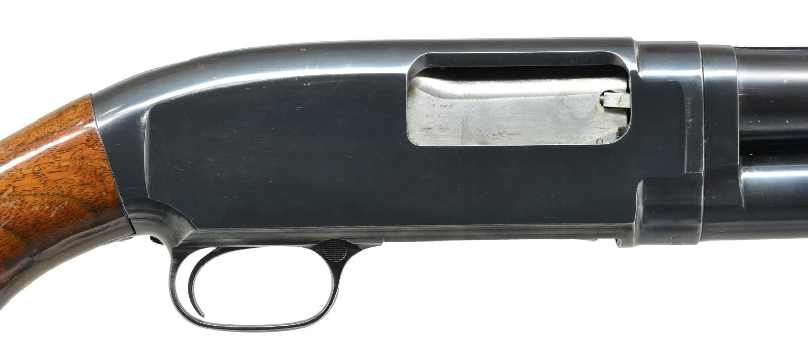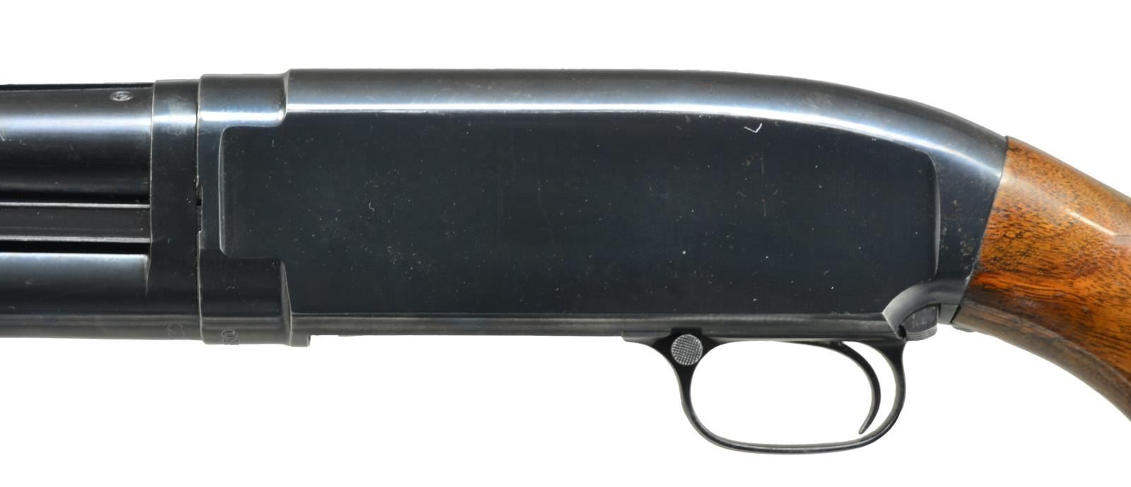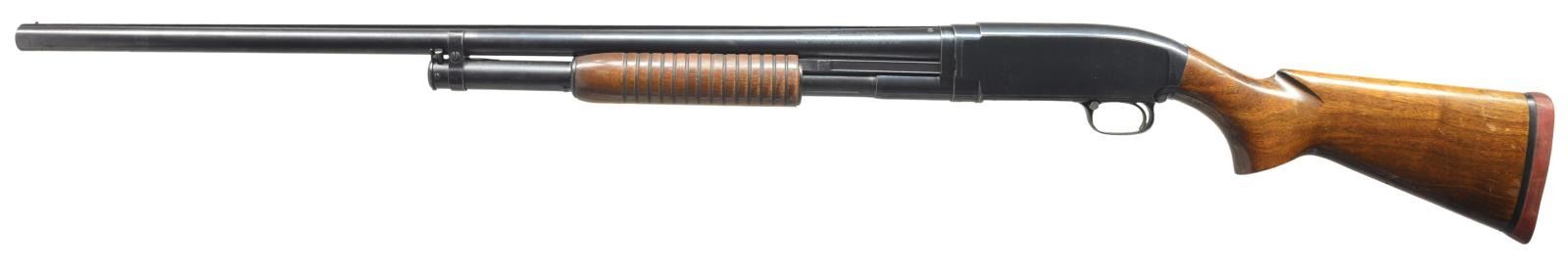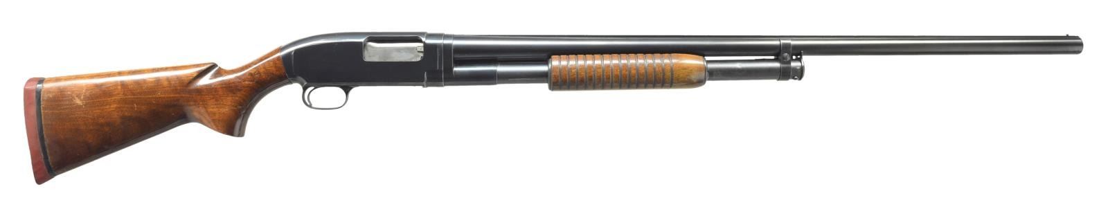 Cal. 12 Ga., "FOR SUPER SPEED & SUPER-X 3 IN". S# 1553650. Bbl. 30" w/ solid rib & fixed Full choke. Steel front bead. Flat bottom grooved forearm. Pistol grip walnut stock. LOP: shortened to 12 3/4" w/ reattached solid red pad. 1956 Mfg. CONDITION: over 90% blue showing slide & edge wear w/ scattered sm. marks. Original wood finish shows wear spots, scratches & handling marks. Very good bore w/ some plastic fouling. (21-2198/DS). CURIO. $450-675.