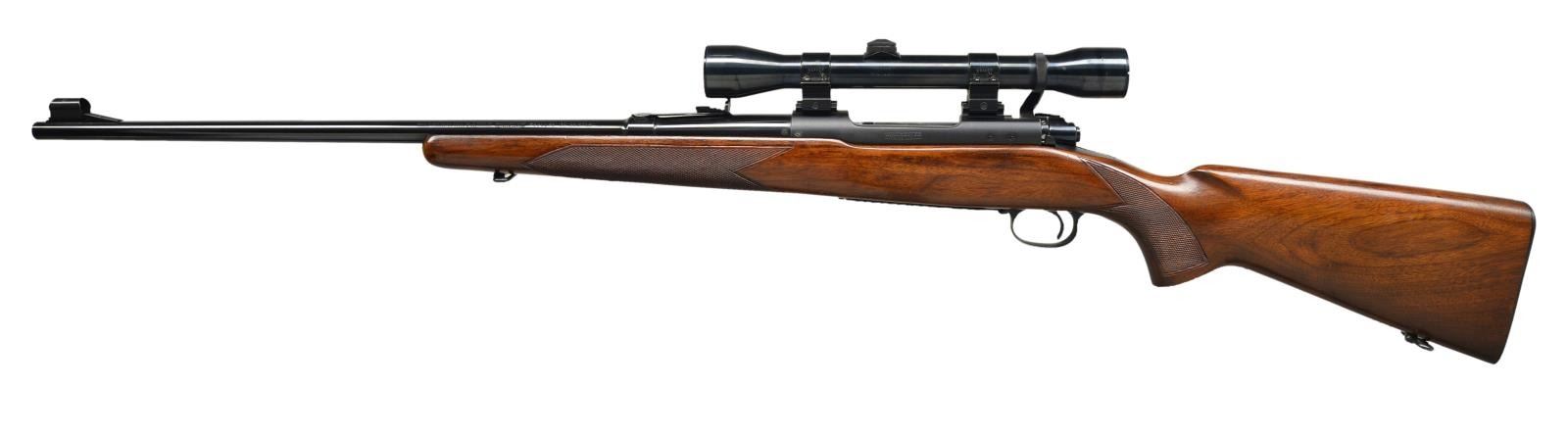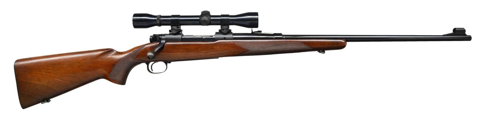 Cal. 30-06. S# 387110. Bbl. 24" with hooded ramped silver bead front sight and elevator adjustable 22G (3C elevator) rear. Mfg. 1956 with checkered steel buttplate having widow's peak. Checkered walnut stock with factory 1" swivels. Classic scope set of Weaver mounts and Weaver steel tube K4-E scope having duplex reticle. Truly classic bolt action hunting rifle ensemble. CONDITION: bottom metal has some faint marks and beginning thinning; upper metal and barrel are near excellent in finish. Stock has numerous light handling marks including the checkering. Buttplate has light wear at heel and toe. Bore and scope set (including optics) are near excellent. (22-3697/NW). CURIO. $750-1,000.