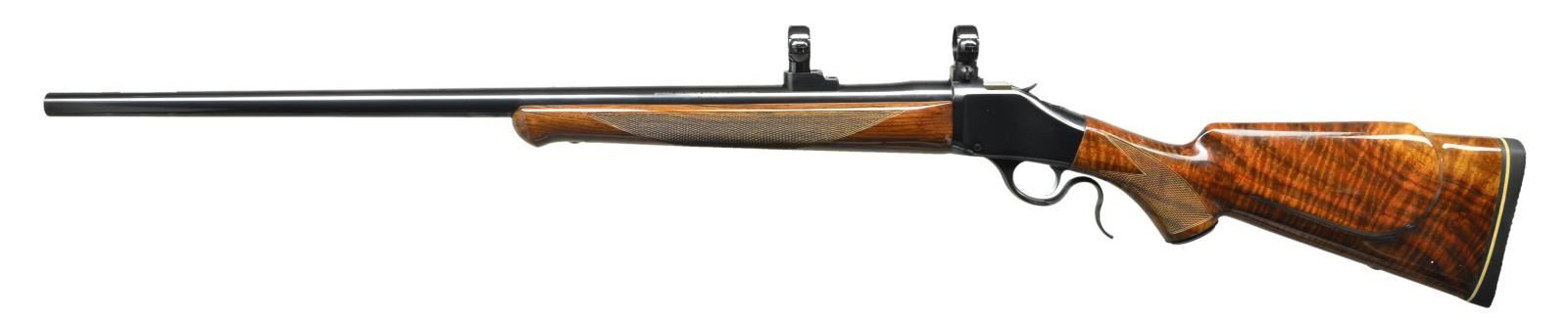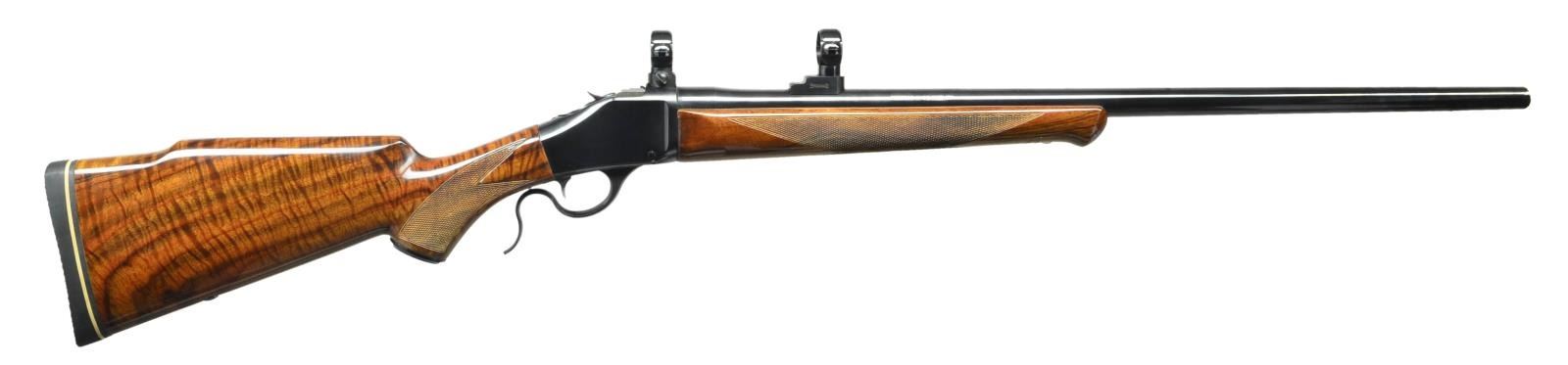 Cal. 22-250. S# W5720248. Bbl. 26". Blued barrel, receiver and finger lever with in the white breech block and trigger. No provisions for sights, but factory 1" rings are installed. High gloss highly figured semi pistol grip stock with checkered forearm and grip along with bright reflective disk on black grip cap. LOP: 13 1/2" to factory recoil pad. CONDITION: metal and stock set are near excellent retaining nearly all of their original factory finish and showing only extremely fine handling marks throughout. Tip of forearm has some older tape residue. Bore is very good, bright and strong. (22-2689/CW). MODERN. $800-1,200.