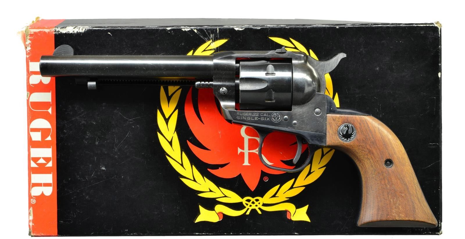 Cal. 22 LR / 22 Mag. S# 371674. Bbl. 5 1/2" w/ serrated semi circular blade sight plus drift adjustable frame mounted rear. LR cyl. matching numbered. Mfg. 1963 (1961-1973) as RSSM w/ alloy ejector housing & black eagle walnut grips. Original lock work w/ out factory safety update. UNATTACHED ACCESSORIES: very good matching numbered box (one broken lid corner & another partially split plus light edge scuffs), 22 Mag. cyl. numbered 911 (proper dimensional fitment; spotty finish loss on face, circular mark from firing pin at rear plus near excellent side), cyl. box, red felt cyl. bag & full warranty card. CONDITION: near excellent original finish, grips & bore. (22-5348/NW). CURIO. $400-600.