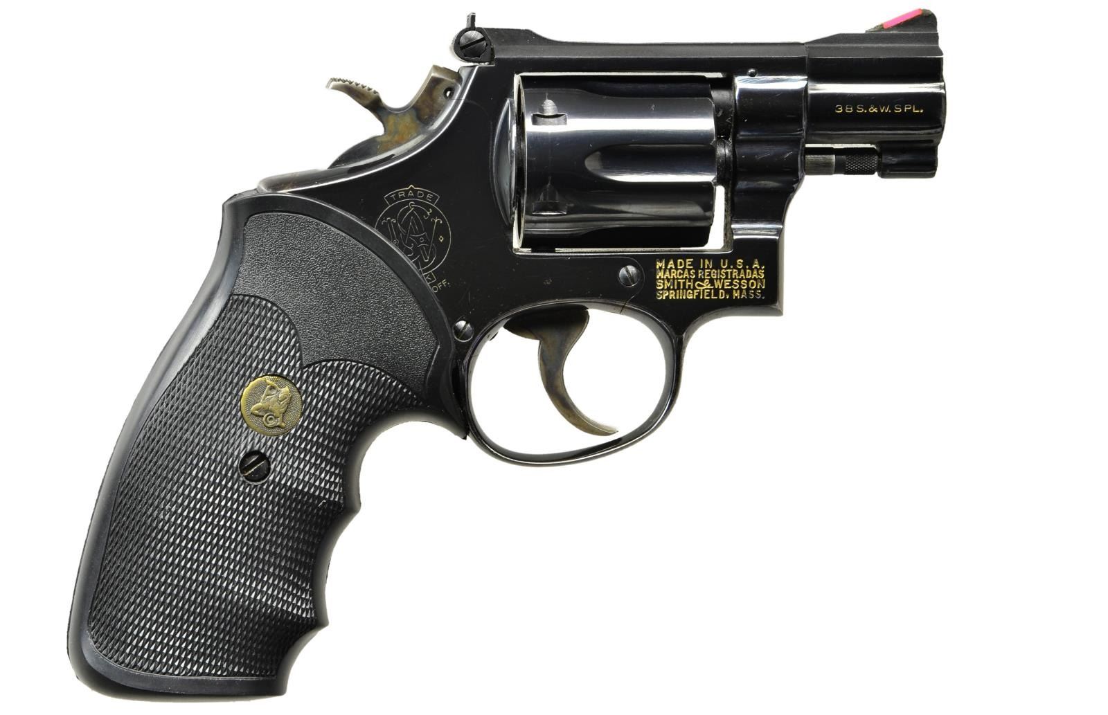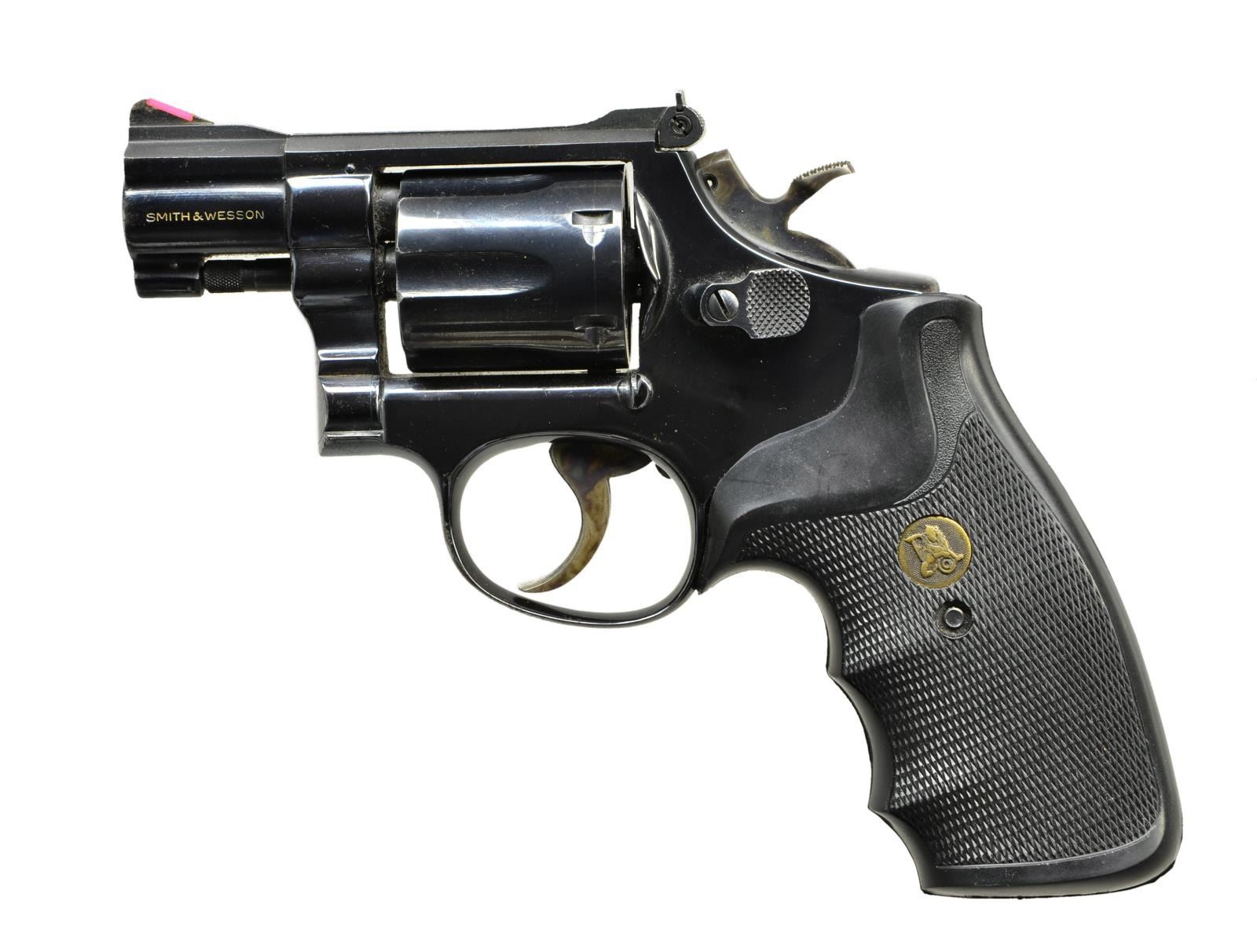 Cal. 38 Special. S# 1K25834. Bbl. 2". K frame with fixed serrated ramp front sight and adjustable rear. Blued finish with case colored spur checkered hammer and serrated trigger. Pachmayr black rubber checkered grips. CONDITION: metal retains about 92% finish with scattered fine to light rust. Grips have solid texture. Bore is very good, bright and strongly rifled. (22-4658/CW). MODERN. $300-500.