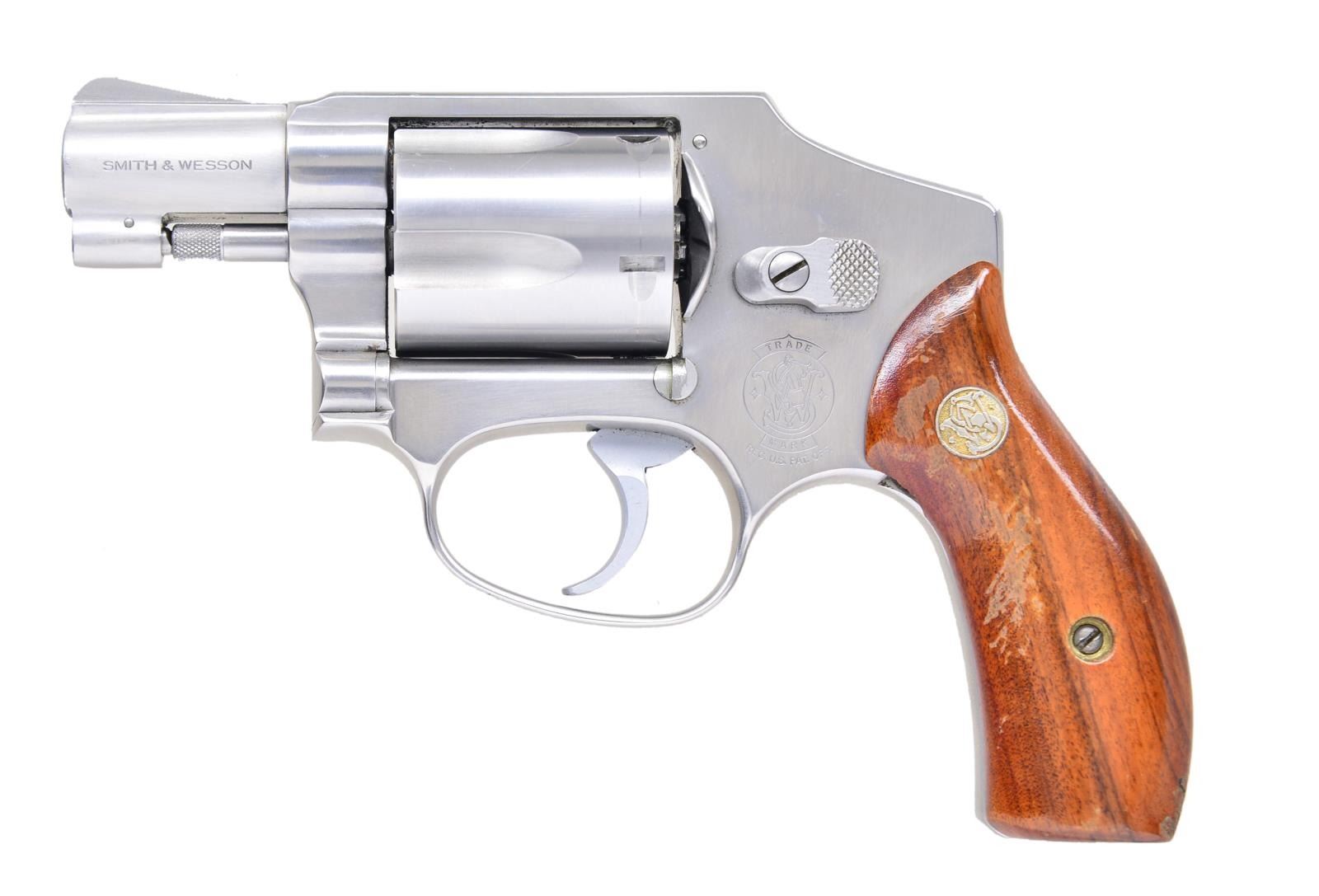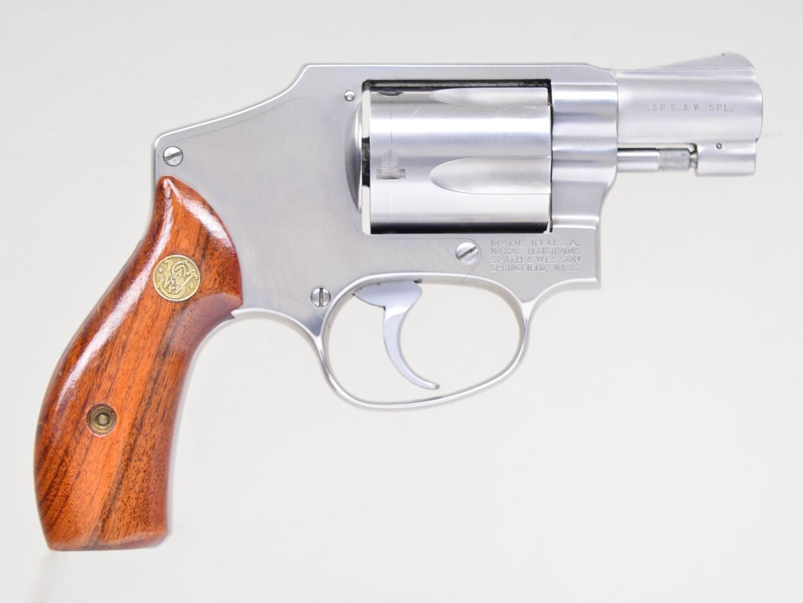 Cal. 38 Special. S# BNC5205. Bbl. 1 7/8". Stainless steel J frame in DAO, 5 shot cylinder with fixed sights and hammerless. Smooth wooden grips with S&W monogram. UNATTACHED ACCESSORIES: factory cardboard box serial numbered to the revolver with cleaning rod, paperwork and Bianchi suede leather holster. CONDITION: light scratches throughout with a visible dragline and some pits on the cylinder. Grips have heavy scratches on left panel. Bore is good plus, strongly rifled but a bit cloudy. (22-5279/CW). MODERN. $400-600.