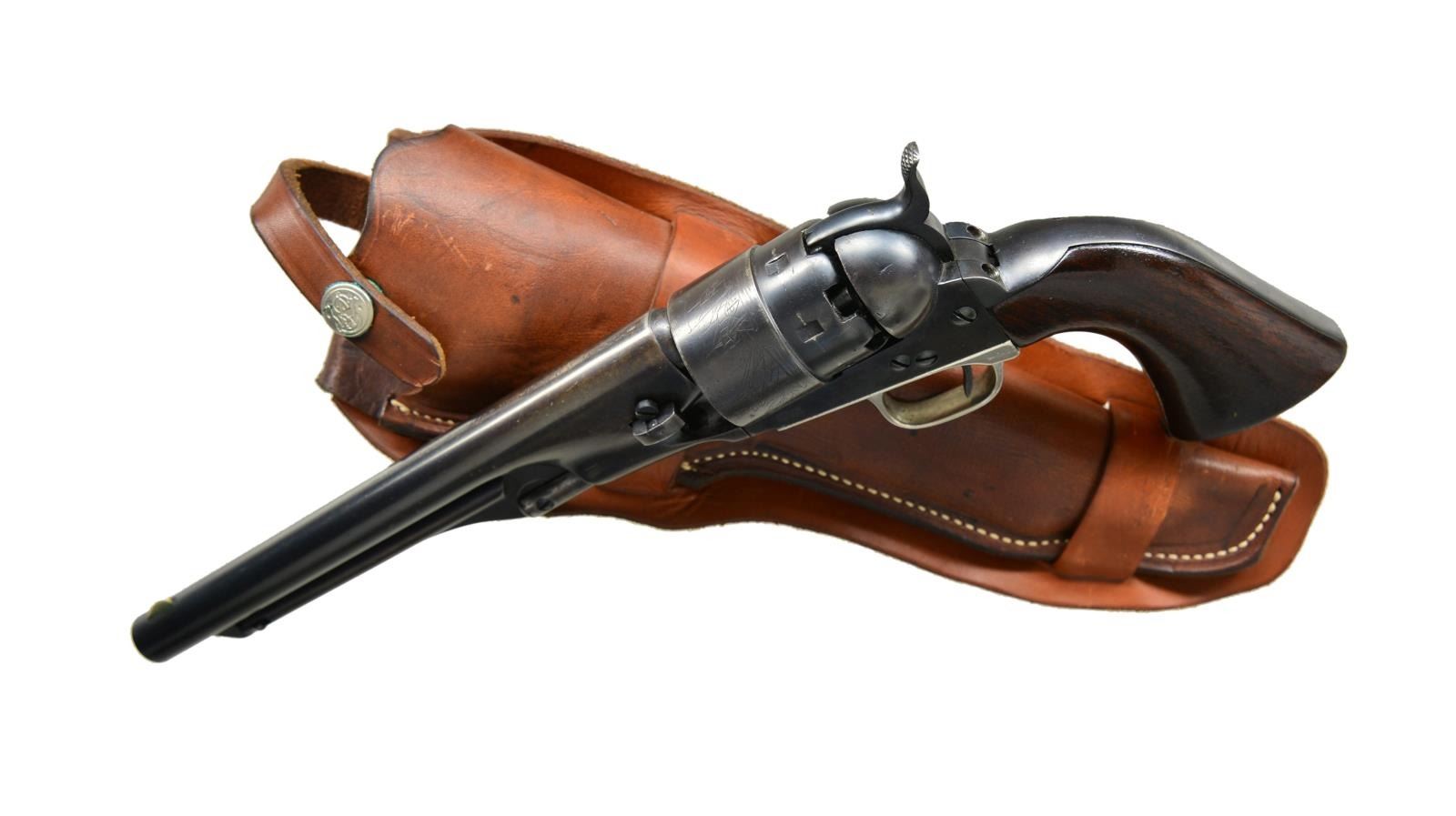 Cal. 44. S# 165700. Bbl. 8". Mfg. 1867 with matching serial numbers throughout; the wedge and loading lever are not marked. Cylinder retains a strong Naval scene. UNATTACHED ACCESSORIES: S&W brown leather RH hip holster. CONDITION: metal was professionally refinished over tiny to light scattered pitting. Grips have an added coat of varnish over some light dings and chipping on the edges. Bore is strongly rifled, reasonably bright with light to moderate patches of pitting. PROVENANCE: Estate of Frank Glenn Marsh. (01-21299/CW). ANTIQUE. $600-900.