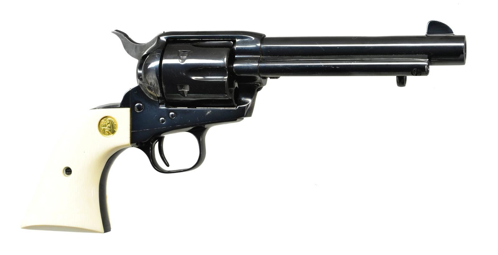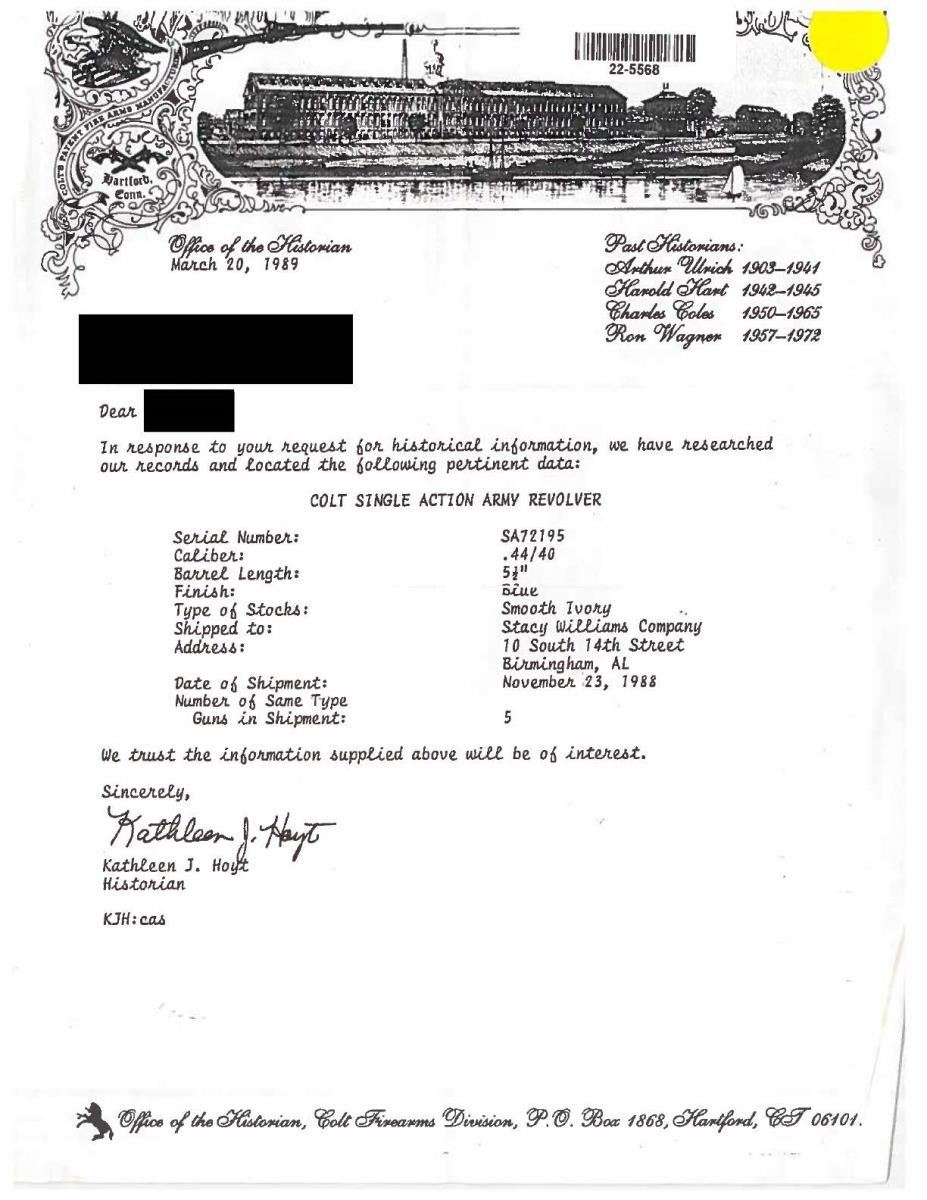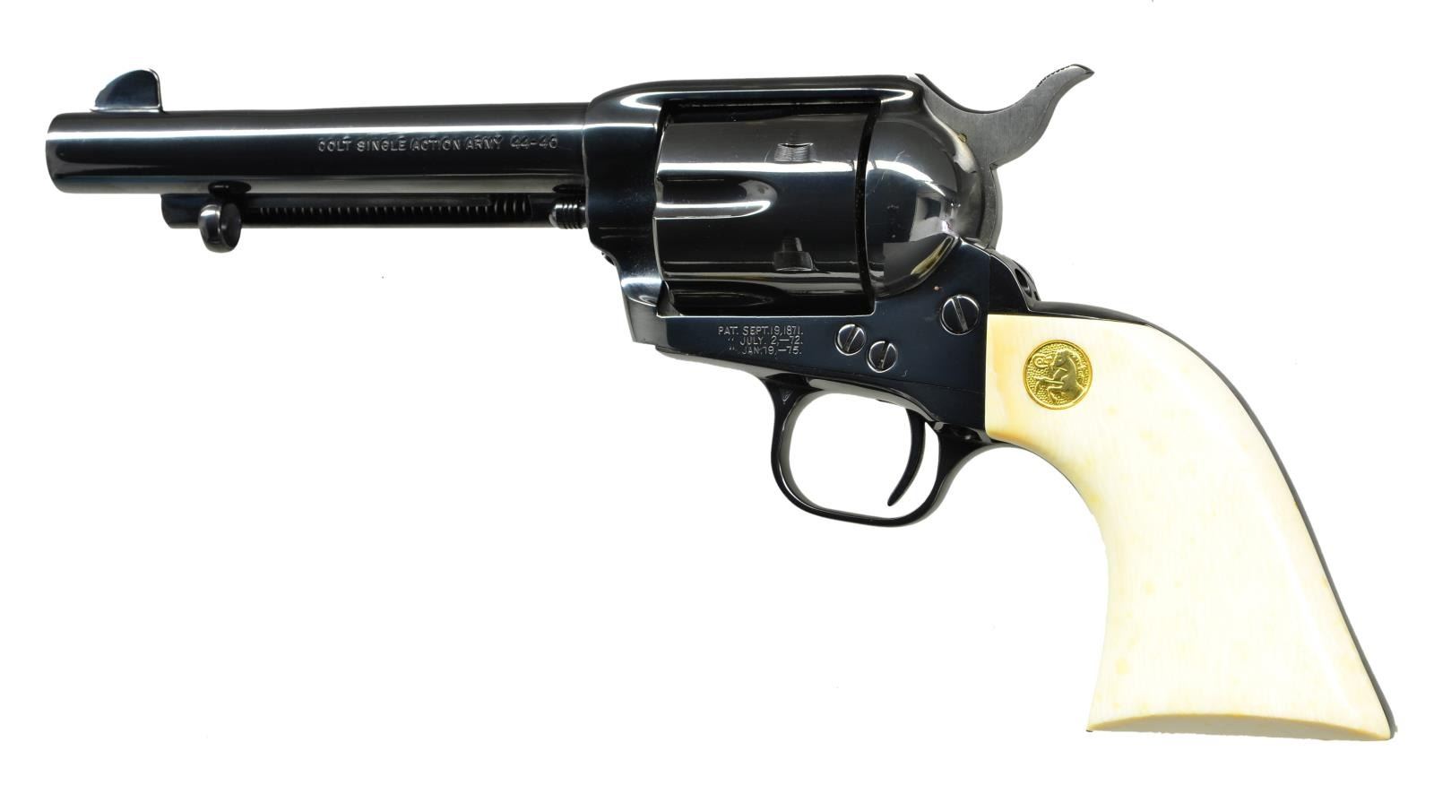 Cal. 44-40. S# SA72195. Bbl. 5 1/2" with blade sight. "Bullseye" ejector rod head. Per factory 1989 letter, shipped November 23, 1988 to Stacy Williams Co. of Birmingham, AL within 5 gun shipment. Matching numbered trigger guard, backstrap and factory installed smooth ivory grips (blind hole on left, screw on right); black powder style frame. Finish listed on letter as "Blue" (including frame) but is Custom Shop style high gloss blue; not standard blue. UNATTACHED ACCESSORIES: Colt letter & factory trigger guard hang tag only. CONDITION: appearance is near excellent to include bore and grips. Slight issue with function needing gunsmith attention: hammer will not release from cocked position unless "fired"; engagement will not allow manual lowering of hammer. (22-5568/NW). MODERN. $1,000-1,500.