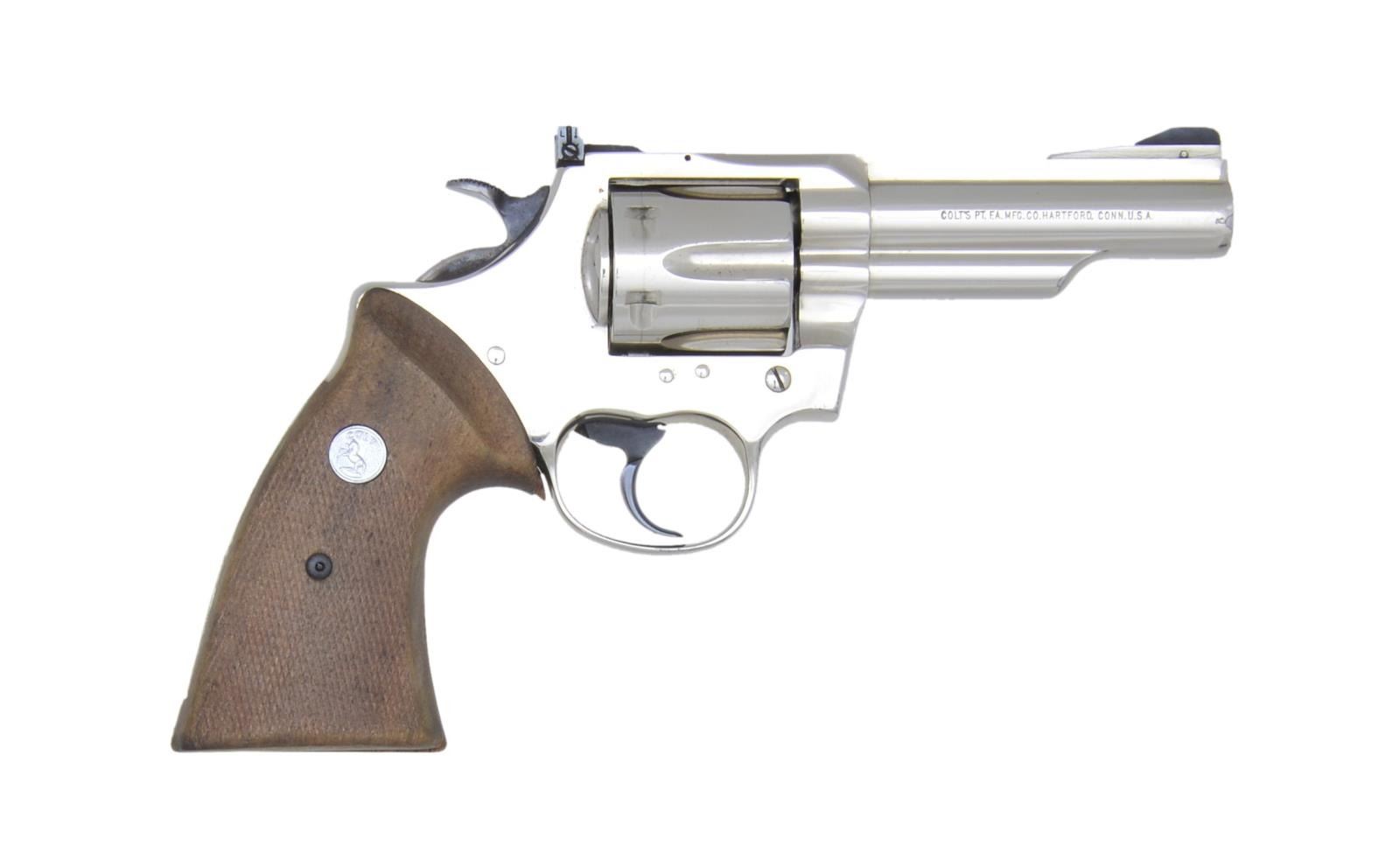 Cal. 357 Mag. S# J46713. Bbl. 4" heavy with rib and shrouded ejector. Serrated ramp front sight with square notch adjustable rear sight. 6 Shot fluted cylinder. Nickel finish with blued hammer and trigger. 2 Piece checkered walnut target grips with silver Rampant Colt medallions. Mfg. 1970. CONDITION: 90% nickel showing muzzle and edge wear with cylinder drag line. Grips have worn finish and checkering. Right panel shows heavy wear and rounding at butt. Bright near excellent bore. (22-3962/DS). CURIO. $500-800.