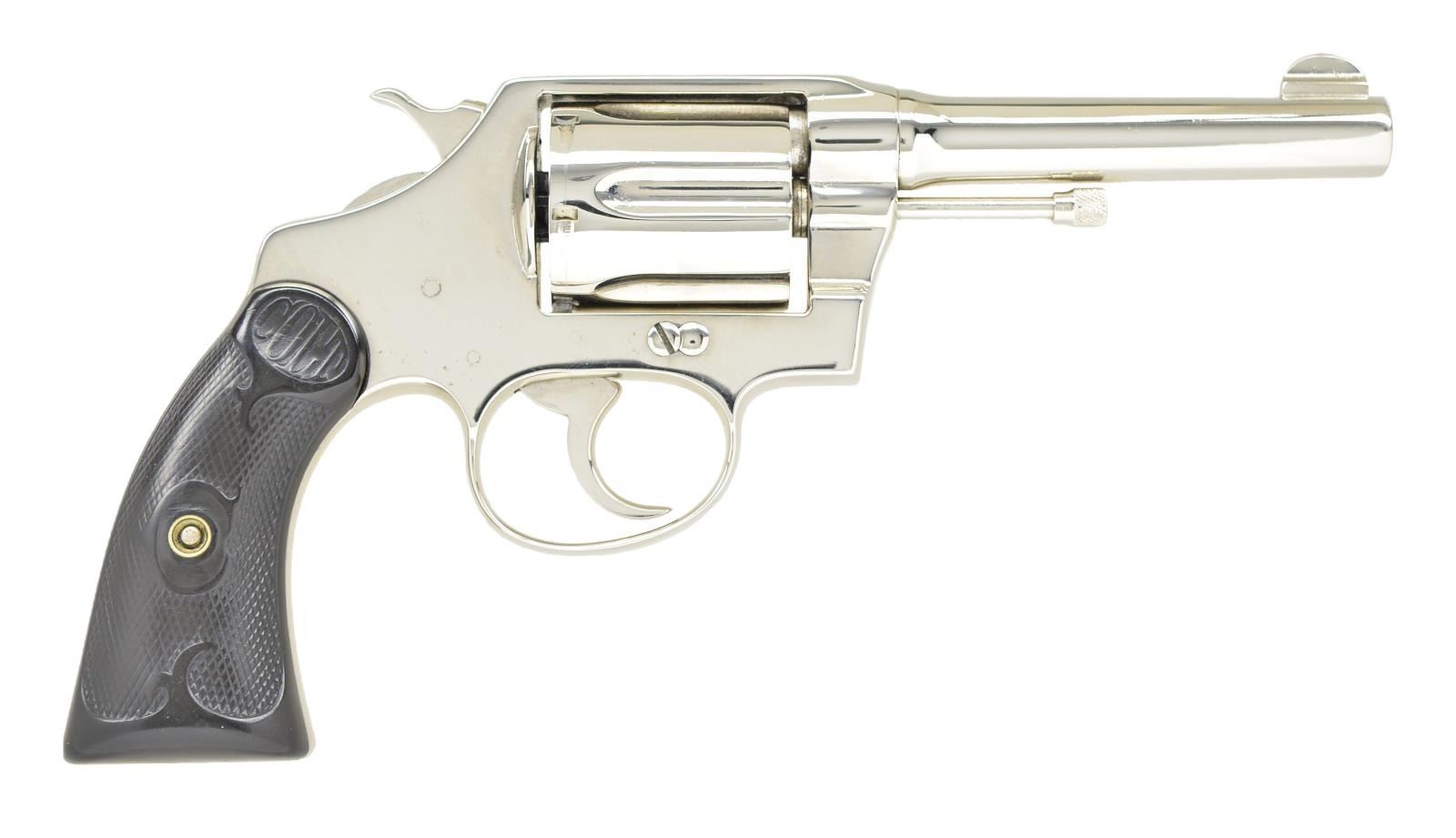 Cal. 32-20. S# 71062. Bbl. 4". Fixed sights with Colt hard rubber grips scratch numbered to the serial number. CONDITION: a thick added coat of highly reflective nickel finish over scattered pitting. Grips are worn smooth. Bore is fair with worn rifling and pitting throughout. (22-3987/CW). CURIO. $200-400.