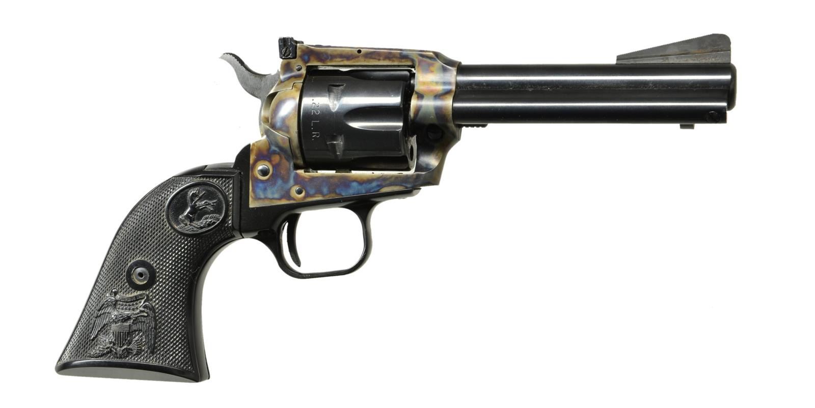 Cal. 22 LR. S# G44162. Bbl. 4 3/8" Similar to Peacemaker except flat top frame, fixed serrated ramp front and adjustable rear sights. Blued barrel and cylinder with case colored frame. Black composite grips with eagle and rampant Colt motif. CONDITION: metal surfaces retain about 97% original finish with some light rust on the front sight and in a cylinder notch. Grips retain strong checkering. Bore is good, bright and strongly rifled. (22-3430/CW). MODERN. $400-600.