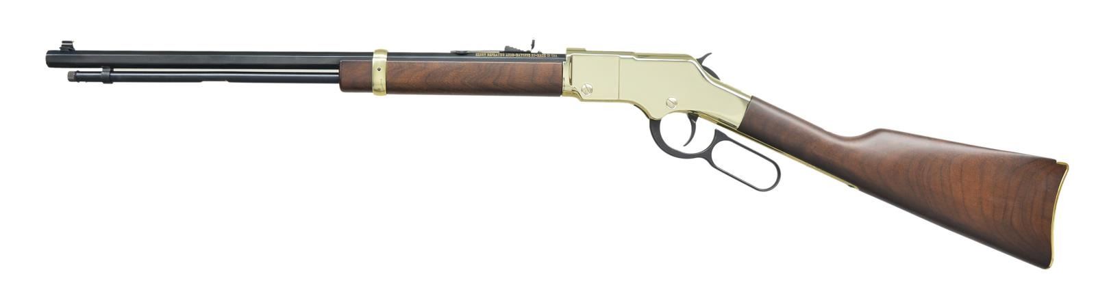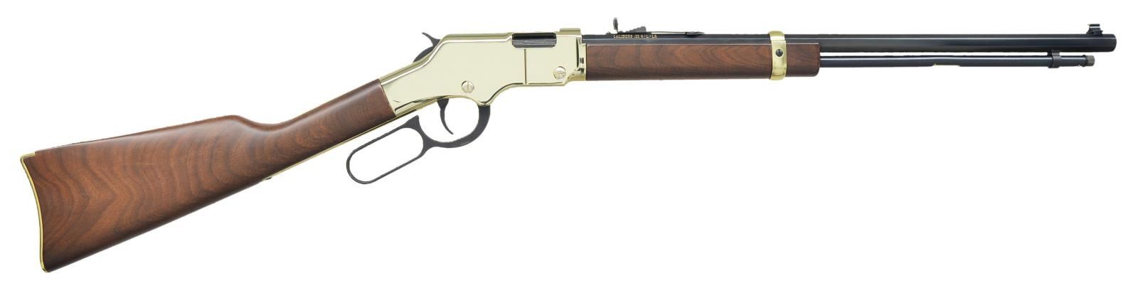 Cal. 22 S/L/LR. S# GB292214. Bbl. 20" Octagonal. Full length magazine tube w/ a capacity of 16 rds. of 22 Long or Long Rifle ammo, or 21 rds. of 22 Short. The iconic Golden Boy rimfire lever action rifle. Gorgeous brass buttplate, barrel band and polished Brasslite receiver. Brass bead front sight w/ fully adj. semi-buckhorn w/ diamond insert rear sight. American Walnut forend & shoulder stock. 1/4 Cock safety. UNATTACHED ACCESSORIES: Matching factory box & paperwork. CONDITION: All aspects appear as new. No noticeable degradation of any kind, aside from a small impression on the stock at 6 O'clock just rear of bottom tang. Bright bore w/ strong rifling. (22-4710/JZ). MODERN. $350-550.