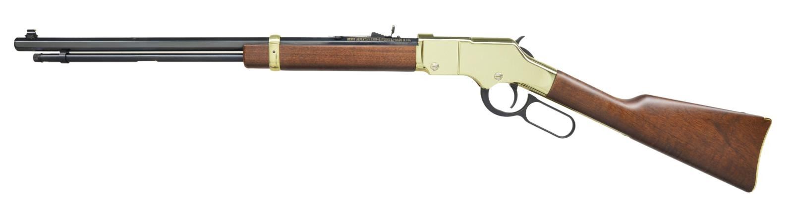 Cal. .22 S/L/LR. S# GB469502. Bbl. 20" Octagonal. A lever action repeating rifle fed through tube under barrel. Hardwood stocks. Finish on receiver, butt plate & barrel band is a bright gold appearance. Other exposed metal surfaces are blued. Dovetailed front blade sight & rear buckhorn sight. Markings on barrel are gold color filled. CONDITION: Gold finish is complete & consistent, & very bright. Blued finish is bold & dark w/ no signs of use aside from a small area of patina on top of barrel, 5.5" from muzzle, which probably coincides w/ vertical rack storage. Wood furniture has no sign of use. Bore is bright w/ sharp rifling. Fire control mechanism appears to function correctly when cycled by hand. (22-4578/JZ). MODERN. $400-600.