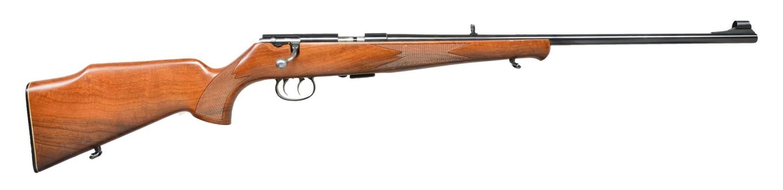 Cal. 22 LR. S# 1304578. Bbl. 22 1/2". Set triggers, hooded ramp fixed front and fold down rear sights. Blued action & triggerguard with in the white bolt and receiver grooved for scope installation. One piece Monte Carlo stock with sling swivels, checkered pistolgrip and forend w/ Schnabel tip. MAGS: 1-5 rd. factory. CONDITION: metal retains about 97% original finish with light marks and scratches. Stock has numerous light marks, scratches and spots of finish loss. Bore is very good, bright and strongly rifled. (22-4936/CW). MODERN. $600-800.