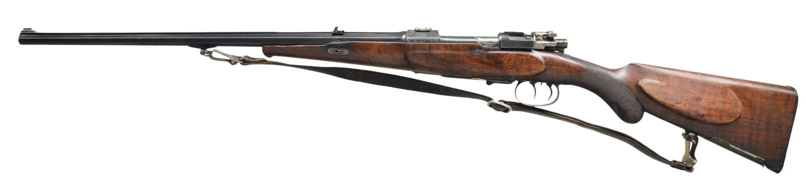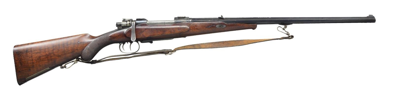 SPORTING BOLT ACTION RIFLE BUILT OFF OF 98 MAUSER ACTION. Cal. 8x57 (8mm Mauser). S# 112560 (underside of receiver). Numbers appearing on most small parts appear to match S#. Bbl. 22" w/ matted rib, blade front & 2 leaf V notch rear sight. Bbl. & receiver have "BU" & Imperial Eagle proofs. 98 Mauser action w/ claw style mounts to tops of receiver. Receiver ring has partially obscured maker's markings: left side" "G. L. RASCH / HOFBUCKSENMACHER" & right side "BRAUNSCHWEIG" both markings in banners. Receiver edges have vine type borders. Dbl. set triggers. Hinged floorplate w/ lever release. Mauser 98 style bolt assembly w/ checkered butterknife handle, checkered safety tab w/ gold "SICHER" & top of cocking piece checkered w/ black paint. Schnabel tipped rnd. knob pistol grip walnut stock w/ wedge fastening, segmented checkered, sling swivels & decorative checkered steel buttplate. Toeline has ornate 5 shell hinged trap w/ oval engraved "IN DANIKGARER / ERIN NERUAD. 25 SEPTEMBER 1906 / HERM RIMPAU / S L / AUG HAMTE". Right side of buttstock has crown "KM over "D 1737" marking. UNATTACHED ACCESSORIES: wedge & bbl. wedge lug. CONDITION: wedge lug detached from bbl. Bbl. & receiver has fair faded blue blending w/ brown patina showing numerous punch marks around rear sight & receiver along w/ solder residue at front sight. Cocking piece has black paint in protected areas. Sanded & refinished wood has worn checkering at wrist, cracks, gouges, repaired chip at toe, & 2 plug type repairs around heel. Trap plate has replacement screws. Fair bore w/ darkness in the grooves & noticeable rifling. (22-3515/MD). CURIO. $300-500.