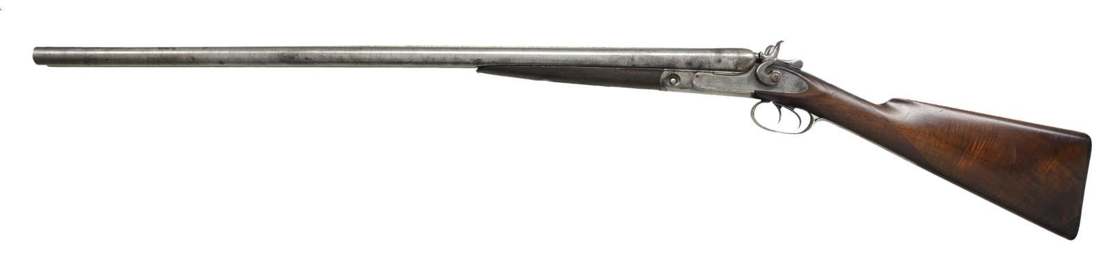 Cal. 12 Ga. S# 52937. Bbl. 30". Mfg 1888 on a #1 frame; matted rib with single front bead. Both bbl’s read “CYL” on gauge. Matching S#’s on frame, barrels and forearm. LOP 13 3/8" & 14 3/8" to Parker hard rubber buttplate. Checkered forend and straight grip stock. CONDITION: bbl's retain solid visible pattern, are gunmetal gray and have scattered pitting & corrosion. Some trace of case color remains on the inside of the forend metal and on the lockplates around the hammers with stronger case on the water table. Checkering is worn nearly smooth. Bores are bright but polished with fine pitting throughout. (01-22085/CW). ANTIQUE. $400-600.