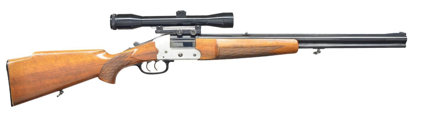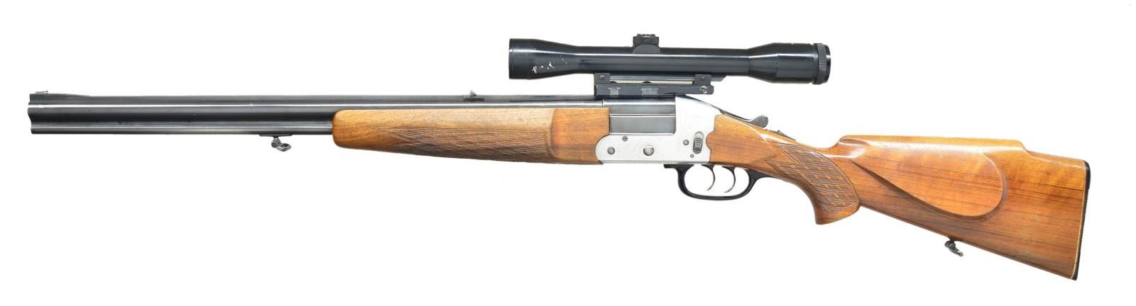 HEYM SCOPE. Cal. 7x57 R / 16 Ga. 2 3/4". S# 04544. The 23 5/8" monobloc bbls. are fitted w/ flipover rear & silver bead front sights in full length matted rib marked “MOD. 22 SE” & w/ maker’s name & address on milled out portion. Brushed aluminum O/U action w/ 2 trigger cocking system is fitted w/ top tang safety & rifle selector on left side. Action is cast w/ some scroll embellishment & running deer on left & rabbit on right. Bottom is marked w/ Heym trademark & patent info. Trigger guard is black nylon. Lightly figured European walnut pistolgrip stock measures 14 1/4" over target logo hard rubber buttplate. Stock features Monte Carlo comb, swept shadowline right hand cheekpiece, skipline checkering & sling loops. Matching full 1 piece forend screws to bottom bbl. & there is no separate iron. Heym 4x 36 scope w/ 3 post reticle is in 1 piece base which clamps onto top dovetail of action. MEASUREMENTS: SHOTGUN BBL: Bore Diameter: .664". Restriction: .034" (FULL). Min. Wall Thickness: .035". LOP: 14 1/4". CAST: approx. WEIGHT WITH SCOPE: 6 lb. 11 oz. UNATTACHED ACCESSORIES: with black plastic case. CONDITION: fine to very fine, bbls. retaining over 90% original blue w/ some marks & dings. Action shows very little wear to its brushed finish. Stocks retain about 80-85% original oil finish w/ a lg. number of marks & light scratches. Checkering shows light wear, mostly on forend. Bores are bright & shiny. Mechanically good. Scope is fine w/ some marks on exterior, optically clear. (22-4969/MGM). CURIO. $800-1,200.