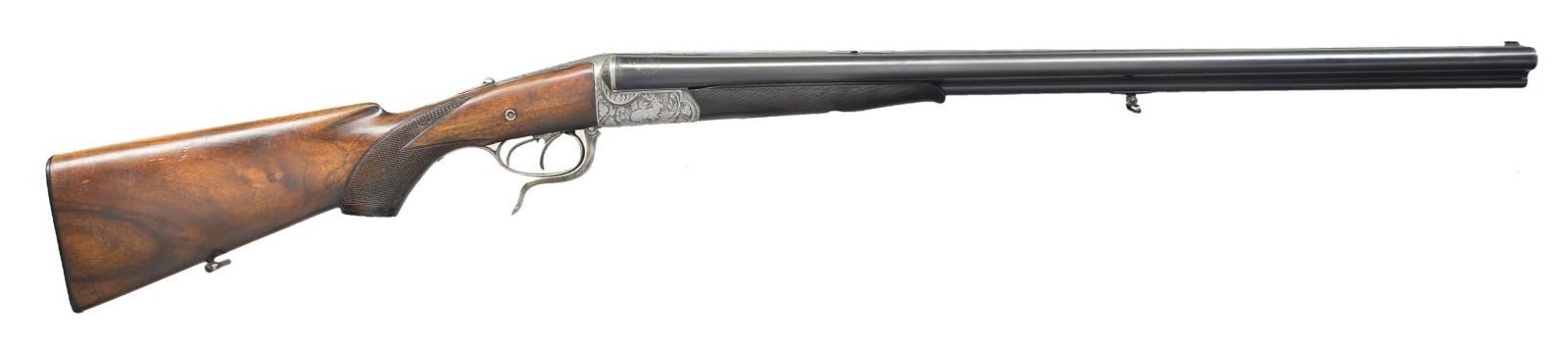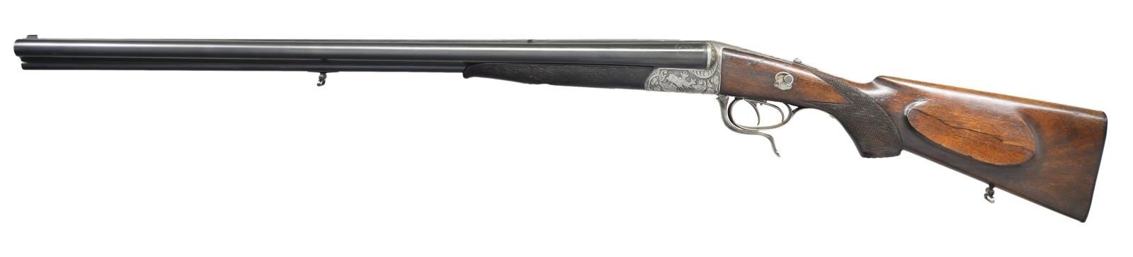 Cal. 16 Ga. 2 3/4" / 9.3x72 R. S# 37826. The Treff action was often used by Meffert & was a fairly unique design w/ strikers hung off of the top tang. They were powered by coil springs. This example has 26 7/8" bbls. w/ popup U-notch rear & gold bead front sights in full length matted rib. Milled out portion of rib at center is engraved “Imman Meffert, Suhl”. Steel logos are stamped at breech ends. Bbl. flats are stamped w/ Imperial German black powder proofs for 16 Ga. & 9.3 rifle cartridge along w/ 1969 Ulm Nitro reproofs for 2 3/4" chambers. Rnd. bodied underlever Treff action features rifle selector on top tang which also has pin type cocking indicators. Drilling is also fitted w/ Greener type side safety & dbl. triggers (front set). Action is engraved w/ near full coverage scrolling acanthus in nicely shaded background which surrounds game scenes w/ a roebuck & doe on left side & a recumbant stag on right. Top tang is silver inlaid “TREFF” over “D.R.G.M.”. Trigger guard is steel. Slightly marbled European walnut capped pistol grip buttstock measures 14 1/8" over ribbed horn buttplate. Stock features right hand cheekpiece, point pattern grip checkering, starburst horn gripcap & sling loop. Matching splinter forend has Deeley release. MEASUREMENTS: BBLS: Bore Diameter: R .667", L .667". Restriction: R .005" (IC), L .030" (FULL). Min. Wall Thickness: R .030". L .040". STOCK: DAH: 2 3/4". DAC: 1 3/8". LOP: 14 1/8". CAST: approx. 1/2" off. WEIGHT: 7 lb. 1 oz. UNATTACHED ACCESSORIES: black plastic case. CONDITION: good as partially refinished. Bbls. retain nearly all of a shiny reblack, engraving somewhat softened. Action cleaned to silver gray. What is most likely an early replacement buttstock retains most of an oil refinish w/ some minor marks. Checkering w/ missing diamonds has slight wear. Forend w/ original wood has old refinish. Checkering shows extreme wear & is almost perished on bottom. Shotgun bores are shiny but show some scattered pitting & frosting. Rifle bore has some shine but shows considerable light pitting at breech end. Action is slightly loose. Left bbl. will not cock. (22-5011/MGM). CURIO. $800-1,200.