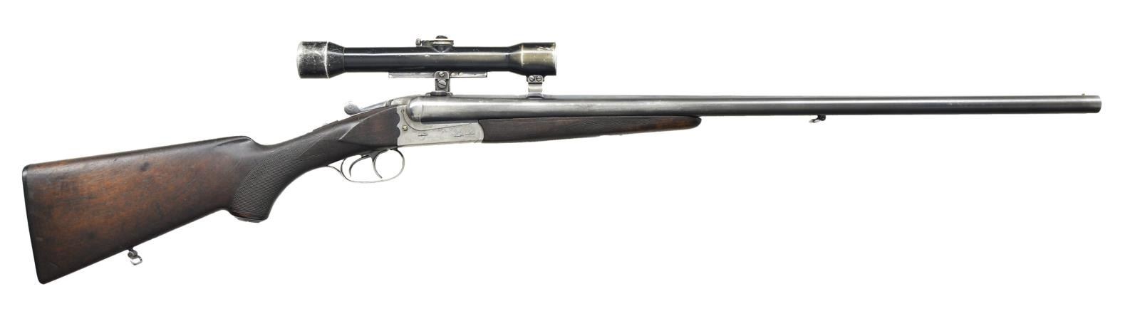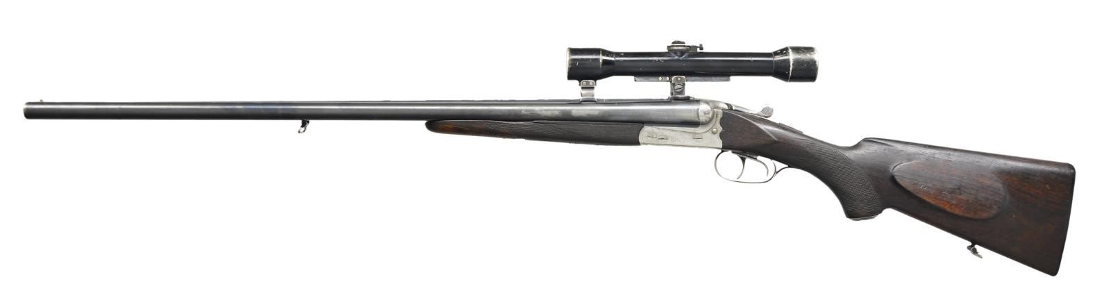 Cal. 12 Ga., 2 3/4”. S# 508782. Bbl. 28 3/8” with raised matted rib. Fitted with German claw mounts holding a Carl Zeiss Zielvier post reticle scope. Extractor box lock action with double triggers and simple scroll engraving. Checkered pistol grip walnut stock with cheek rest. Import marked just forward of the forearm. UNATTACHED ACCESSORIES: black plastic case. CONDITION overall good to fair with some areas of heavy thinning finish on Bbl around carry areas. Stock shows wear and scattered handling marks with a fairly large split chip on the left side of the forearm. Very good bright and shiny bore’s. Good optics are slightly cloudy. (22-4982/ZAL). CURIO. $400-600