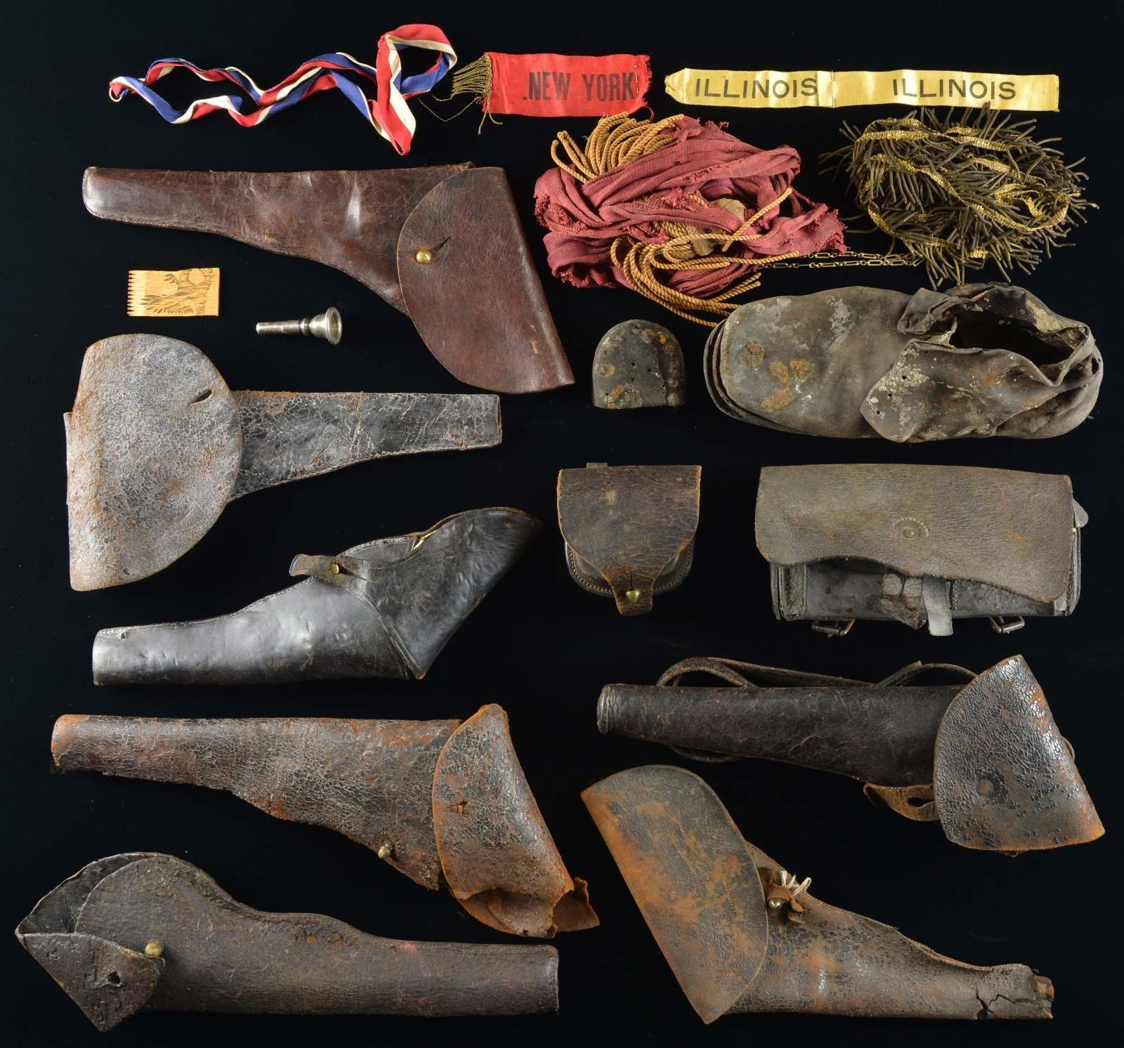 RELICS & MORE. This varied group includes 1 M1864 cartridge box with all straps & buckles intact. / 1 Civil War period carbine box with an exceptionally dry & crazed front flap. / 1 Civil War era pistol holster for a small caliber pistol. / 1 Civil War period Colt Army holster in relic condition. / 1 Civil War period naval enlisted man's belt of dark buff leather. / 1 Civil War era holster possibly for a Colt Navy attached to what appears to be an over the shoulder strap. / 1 Confederate Richmond pike head complete with brass ferrule. Pike appears to have been made into a side knife sometime after the war. / 1 Large excavated bullet mold believed to be .58 cal. in relic condition & frozen shut. / 2 Post Civil War tin cups. / 1 Civil War period cap box with belt loops intact. Box has a crazed finish. / 1 Maroon sash in very tattered relic condition. / 1 Scabbard for a Civil War .58 cal. bayonet in poor condition. / 1 Civil War period holster in poor condition. / A 15" section of a cavalry saber's scabbard. / 1 Civil War bayonet scabbard likely for a .58 cal. rifle. / 1 Civil War period holster in relic condition. / 1 Civil War period brogan that appears excavated & is in relic condition. / 1 Civil War period holster in heavily used condition possibly for a Colt Army. / 1 Pre-war militia bayonet scabbard in well used condition. / 1 Solid wood fife with a crack at the end. / 1 Civil War era brown leather holster. / 1 Pre-Civil War fascine knife. / 1 Confederate excavated canteen that has been partially crushed. / 1 Excavated sardine can. / 1 Excavated .58 cal. cartridge box insert. / 5 Excavated Civil War screw in artillery fuses. / 1 knife blade measuring 11". / 1 Pair of mother of pearl opera glasses. / 1 Excavated US cartridge box plate. / 1 Small print of Camp Huntington of the 5th Regiment Connecticut Volunteers in frame. / 2 Table knives & 1 fork. / 1 Very faded ambrotype of a soldier in a thermoplastic case. / 3 Pieces of grapeshot. / 1 Wooden fid. / 1 Gate hasp. / 1 Excavated nail puller in relic condition. / 1 Group of 6 excavated British & American pennies. / 1 Bag containing a length of gold bullion trim, red white & blue ribbon, 3 state ribbons, 1 watch chain, a trumpet mouthpiece & a section of matches. CONDITION: all items show expected wear except as noted. (02-16854-2/BF). $1,500-2,200.
