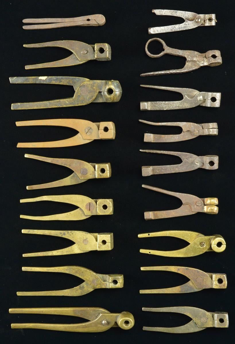 Includes 11 brass conical & 7 iron ball bullet molds. Calibers are mostly 40 & 36. CONDITION: molds appearing in fair patina condition w/ cleaning, pitting & oxidation. 1 Iron mold has brass appearing filled cavities. (02-17168/MD). $1,000-1,400.