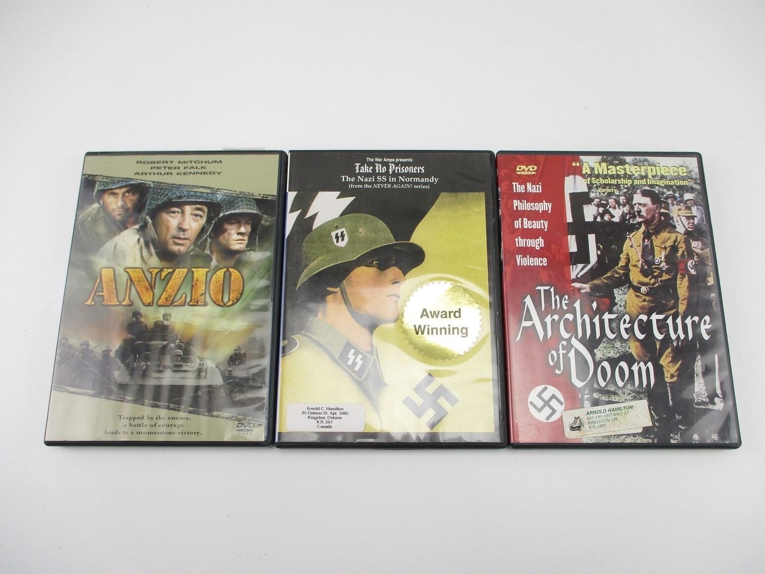 ASSORTED MILITARIA DVD LOT, LOT INCLUDES; (3) DVDS INCL " THE ARCHITECTURE OF DOOM" FROM 1991, DIRECTED BY PETER COHEN, ISBN 2022990921, RARE FILM, ALSO INCLUDED ARE " TAKE NO PRISONERS: THE NAZI SS IN NORMANDY" FROM THE WAR AMPS & " ANZIO" STARRING ROBERT MITCHUM & PETER FALK, ISBN 4339606545, SEE PHOTOS