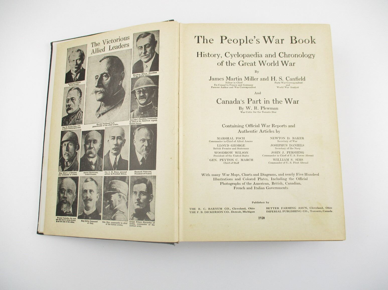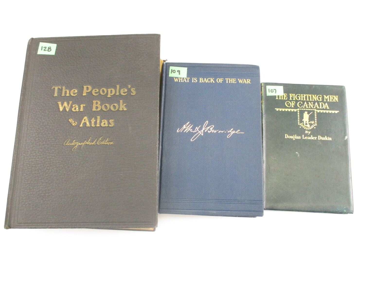 ASSORTED MILITARY BOOK LOT, LOT INCLUDES; (1) " THE FIGHTING MEN OF CANADA" BY DOUGLAS LEADER DURKIN, 1918; (1) "WHAT IS BACK OF THE WAR" BY ALBERT J. BEVERIDGE, 1915 & (1) "THE PEOPLE'S WAR BOOK HISTORY, CYCLOPAEDIA AND CHRONOLOGY OF THE GREAT WORLD WAR AND CANADA'S PART IN THE WAR" BY JAMES MARTIN MILLER, H.S. CANFIELD & W.R. PLEWMAN, 1920, PUBLISHED BY R.C. BARNUM CO., F.B.DICKERSON CO., BETTER FARMING ASS'N & IMPERIAL PUBLISHING CO., SEE PHOTOS