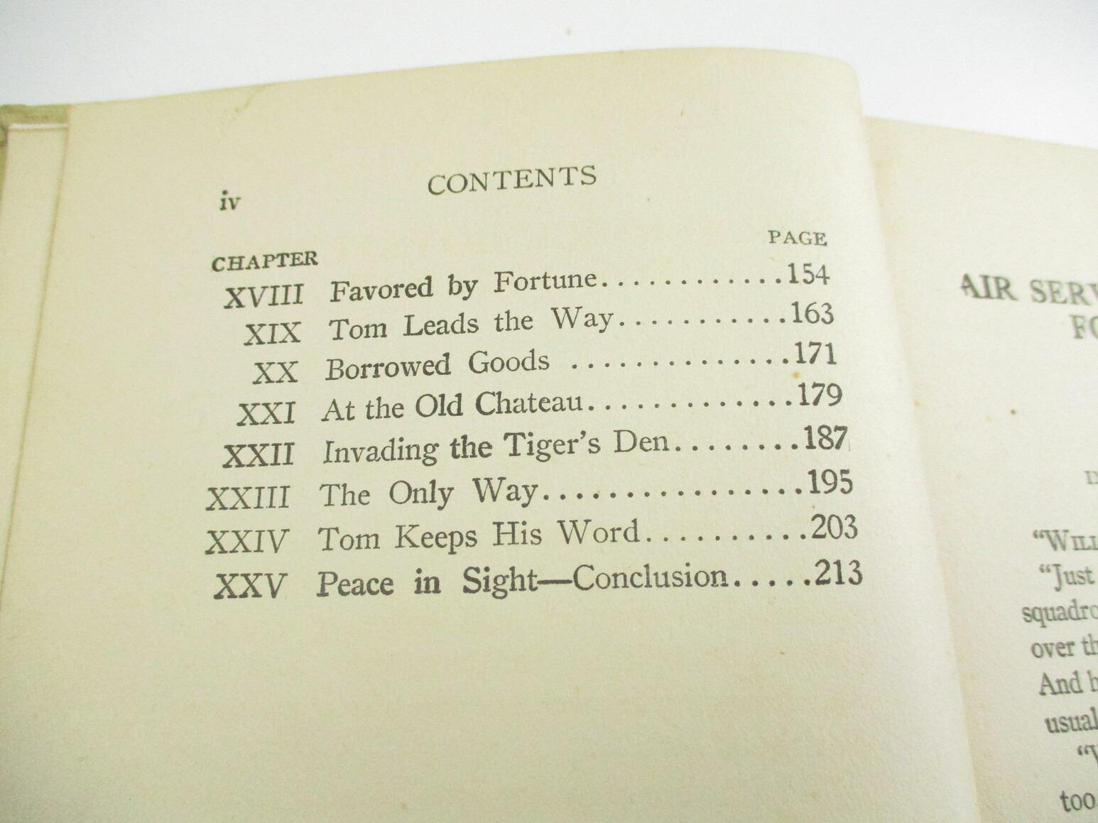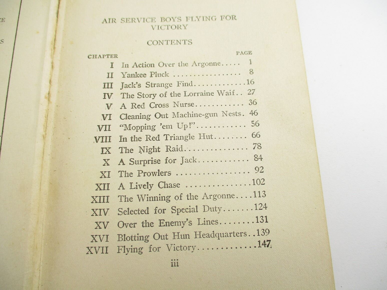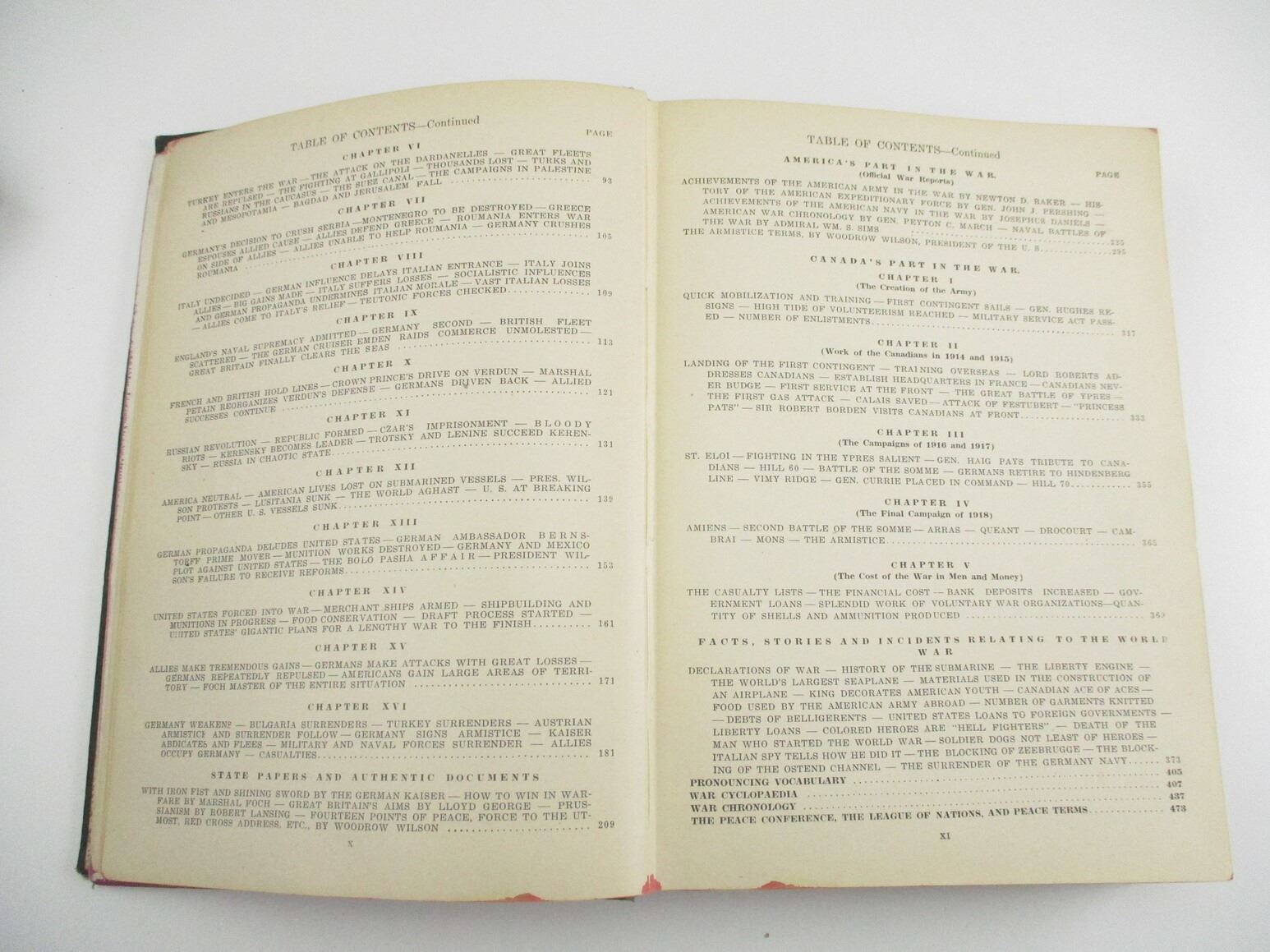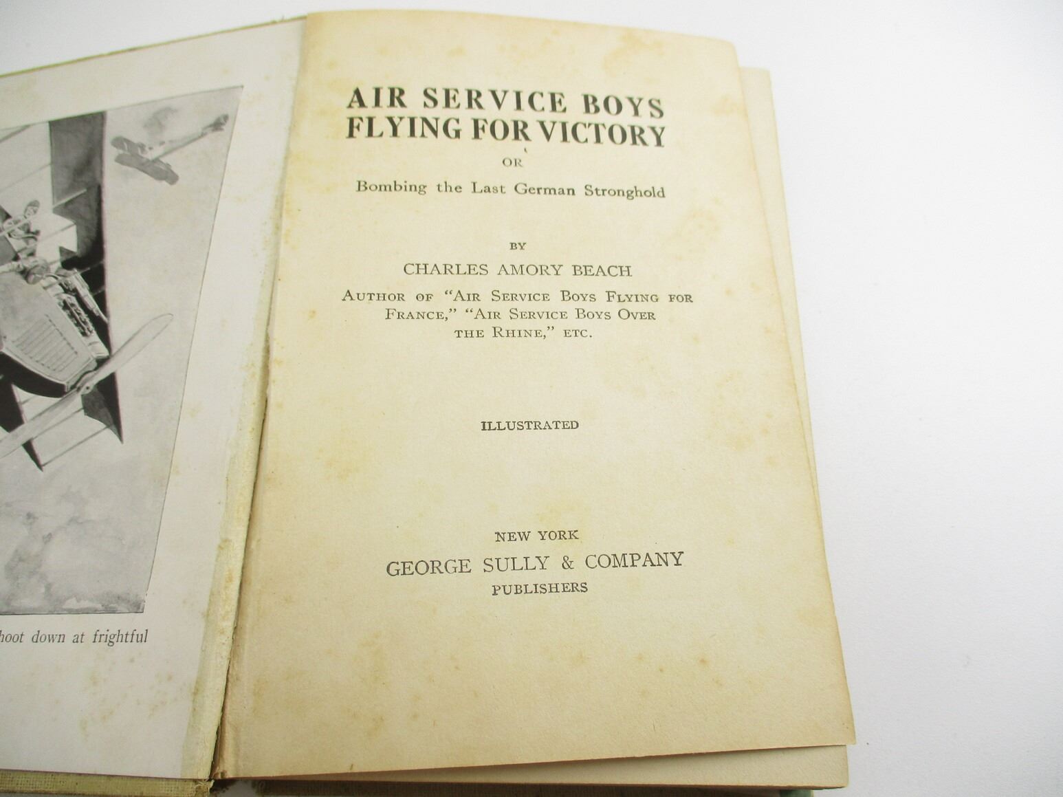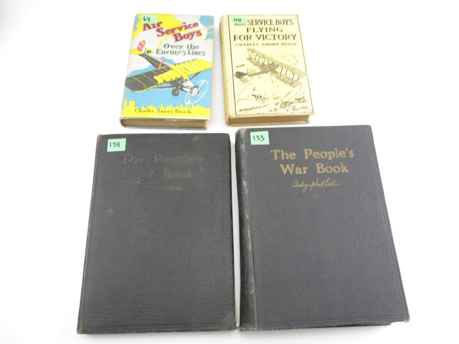 ASSORTED MILITARY BOOK LOT, LOT OF 4: (1) "AIR SERVICE BOYS OVER THE ENEMY'S LINES" BY CHARLES AMORY BEACH, 1919; (1) "AIR SERVICE BOYS FLYING FOR VICTORY" BY CHARLES AMORY BEACH, 1920; (1) "THE PEOPLE'S WAR BOOK HISTORY, CYCLOPAEDIA AND CHRONOLOGY OF THE GREAT WORLD WAR AND CANADA'S PART IN THE WAR BY JAMES MARTIN MILLER, H.S. CANFIELD & W.R. PLEWMAN, 1920, PUBLISHED BY R.C. BARNUM CO., F.B.DICKERSON CO., BETTER FARMING ASS'N & IMPERIAL PUBLISHING CO., MISSING PAGES; (1) "THE PEOPLE'S WAR BOOK HISTORY, CYCLOPAEDIA AND CHRONOLOGY OF THE GREAT WORLD WAR AND CANADA'S PART IN THE WAR BY JAMES MARTIN MILLER, H.S. CANFIELD & W.R. PLEWMAN, 1920, PUBLISHED BY R.C. BARNUM CO., F.B.DICKERSON CO., BETTER FARMING ASS'N & IMPERIAL PUBLISHING CO., MISSING PAGES, SEE PHOTOS