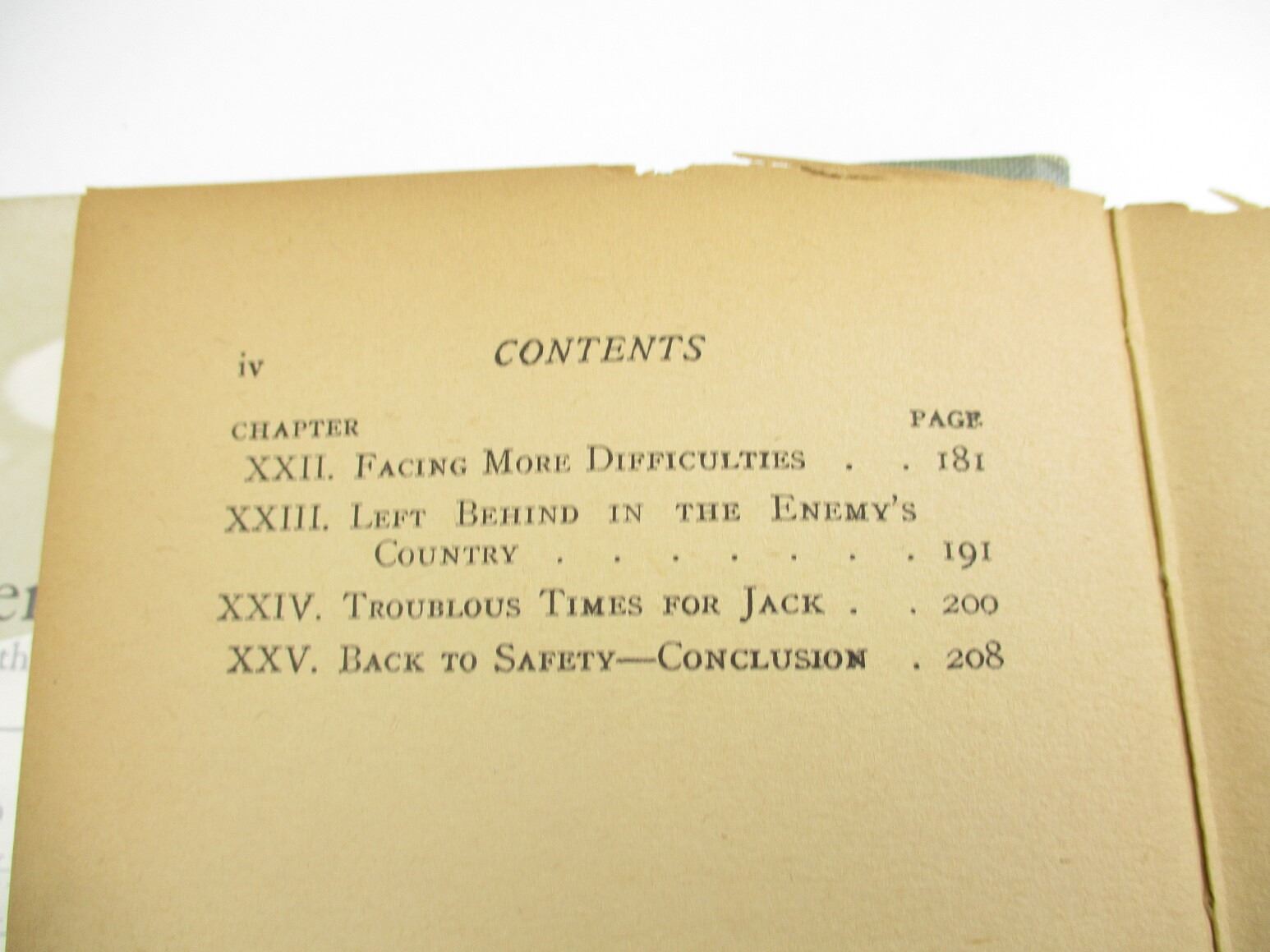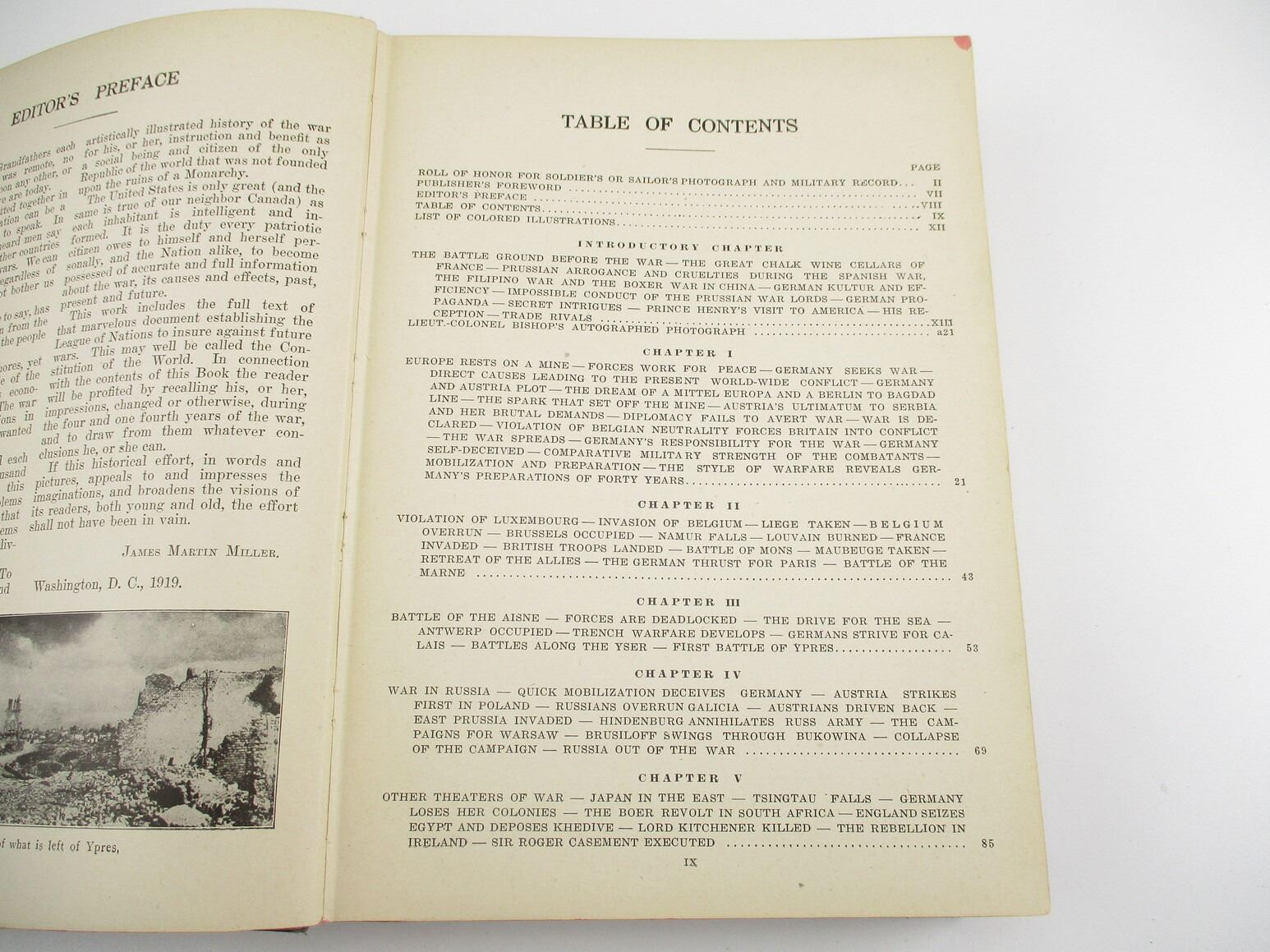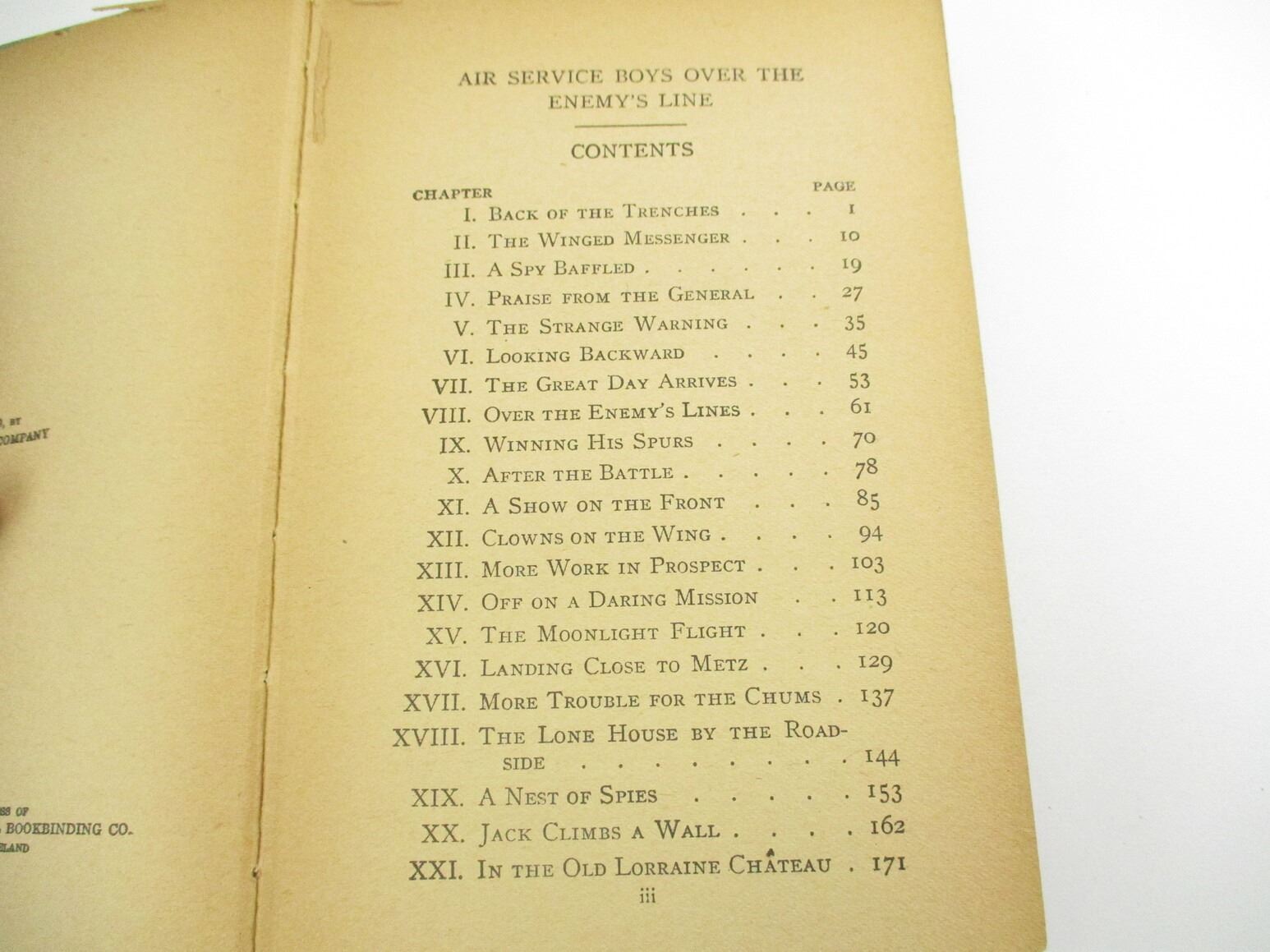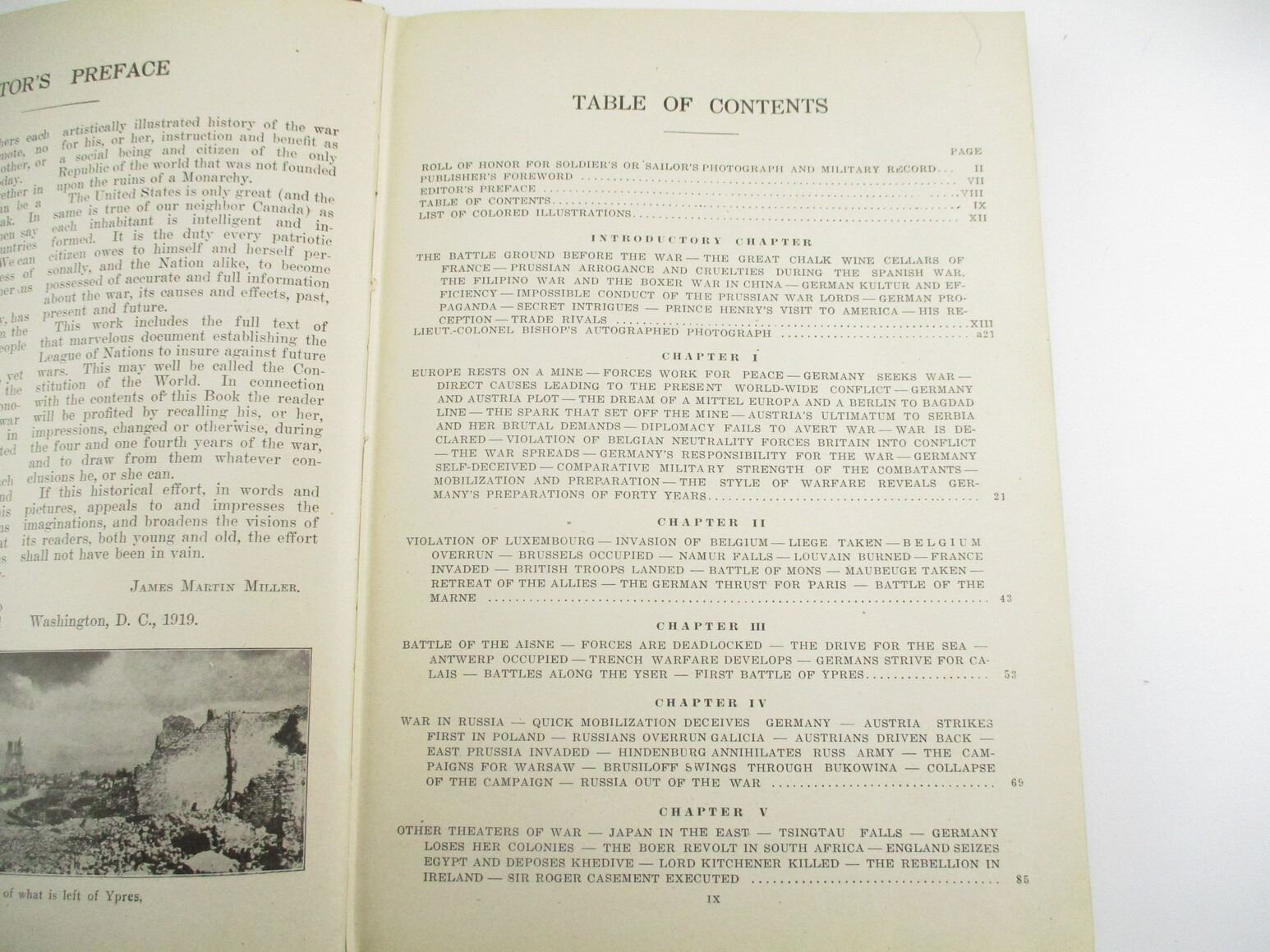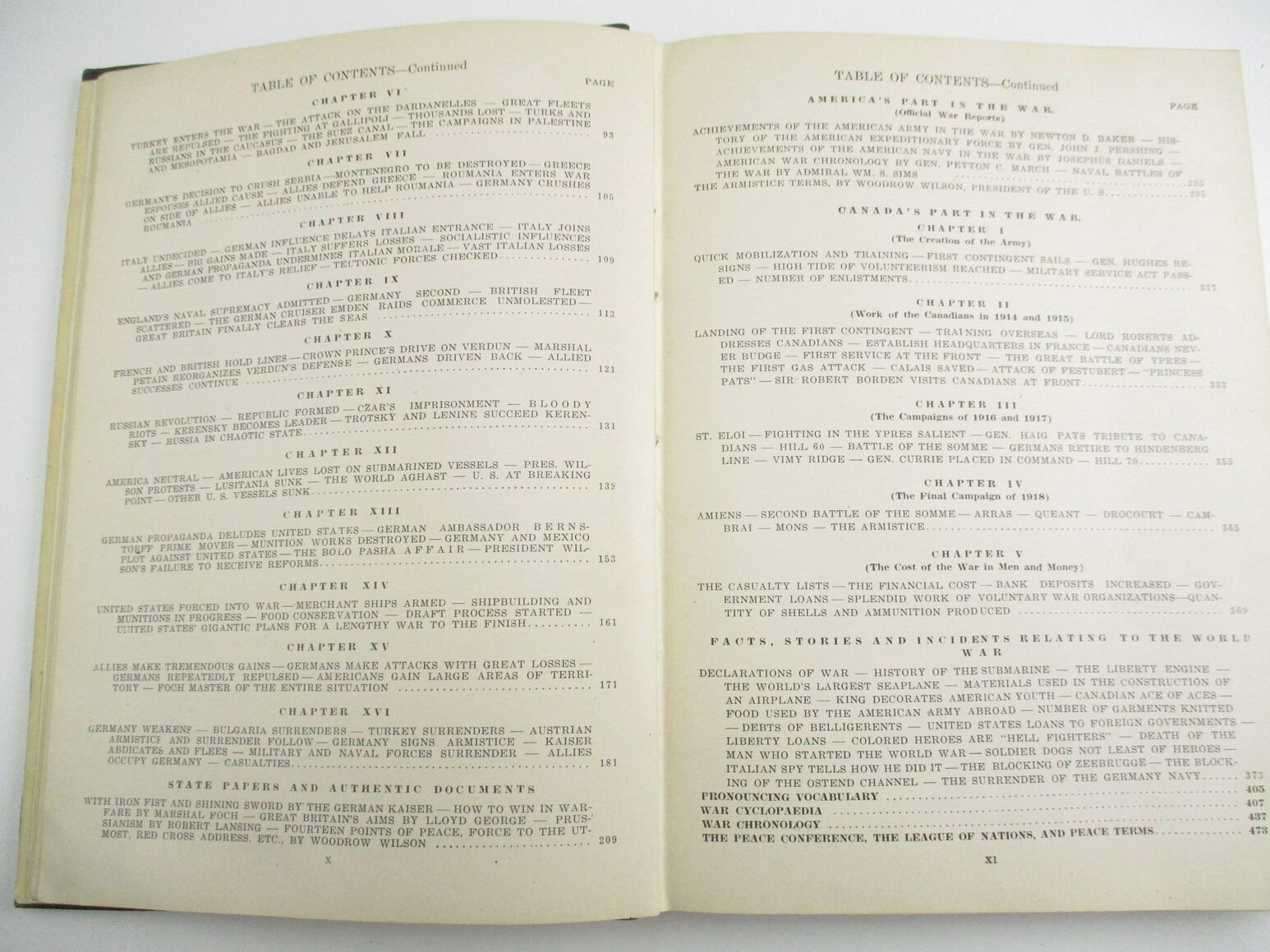 ASSORTED MILITARY BOOK LOT, LOT OF 4: (1) "AIR SERVICE BOYS OVER THE ENEMY'S LINES" BY CHARLES AMORY BEACH, 1919; (1) "AIR SERVICE BOYS FLYING FOR VICTORY" BY CHARLES AMORY BEACH, 1920; (1) "THE PEOPLE'S WAR BOOK HISTORY, CYCLOPAEDIA AND CHRONOLOGY OF THE GREAT WORLD WAR AND CANADA'S PART IN THE WAR BY JAMES MARTIN MILLER, H.S. CANFIELD & W.R. PLEWMAN, 1920, PUBLISHED BY R.C. BARNUM CO., F.B.DICKERSON CO., BETTER FARMING ASS'N & IMPERIAL PUBLISHING CO., MISSING PAGES; (1) "THE PEOPLE'S WAR BOOK HISTORY, CYCLOPAEDIA AND CHRONOLOGY OF THE GREAT WORLD WAR AND CANADA'S PART IN THE WAR BY JAMES MARTIN MILLER, H.S. CANFIELD & W.R. PLEWMAN, 1920, PUBLISHED BY R.C. BARNUM CO., F.B.DICKERSON CO., BETTER FARMING ASS'N & IMPERIAL PUBLISHING CO., MISSING PAGES, SEE PHOTOS