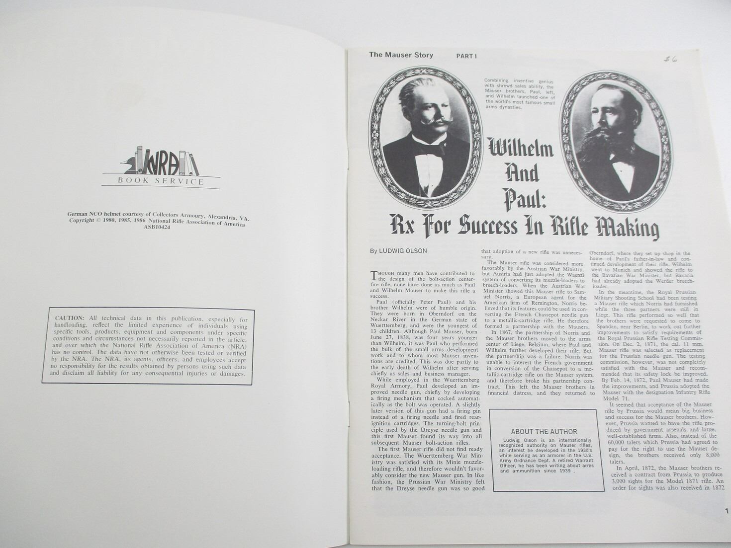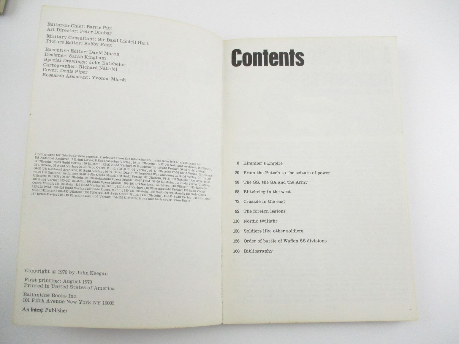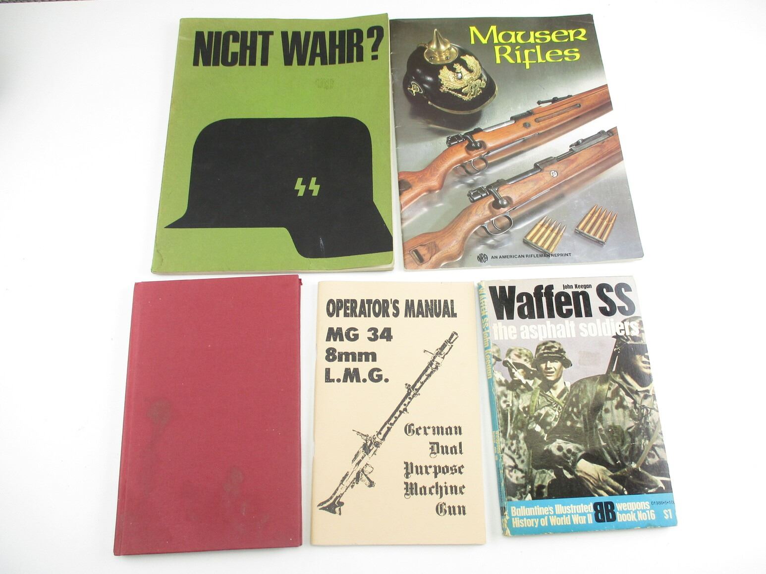 ASSORTED MILITARY BOOK LOT, LOT OF 5: (1) "WAFFEN SS: THE ASPHALT SOLDIERS" BY JOHN KEEGAN, 1970; (1) "GERMAN INFANTRY WEAPONS OF WORLD WAR 2: ARMS & ARMOUR"; (1) "NICHT WAHR?" BY CURZIO MALAPARTE, COMPILED BY TOMI UNGERER, 1966; (1) "MAUSER RIFLES" BY LUDWIG OLSON, 1986; (1) "OPERATOR'S MANUAL MG 34 8MM L.M.G.: GERMAN DUAL PURPOSE MACHINE GUN" ISSUED BY THE AMERICAN WAR DEPT. IN 1943, SEE PHOTOS