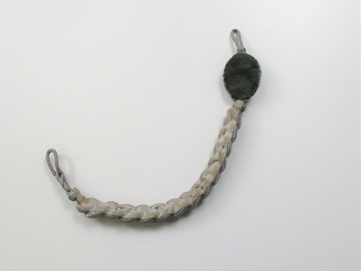 WWII GERMAN MARKSMAN SHIP LANYARD, (1) SILVER THREADS WITH EAGLE SHIELD, SHOWS AGE / WEAR, OAL APPROX. 12". SEE PHOTOS.
