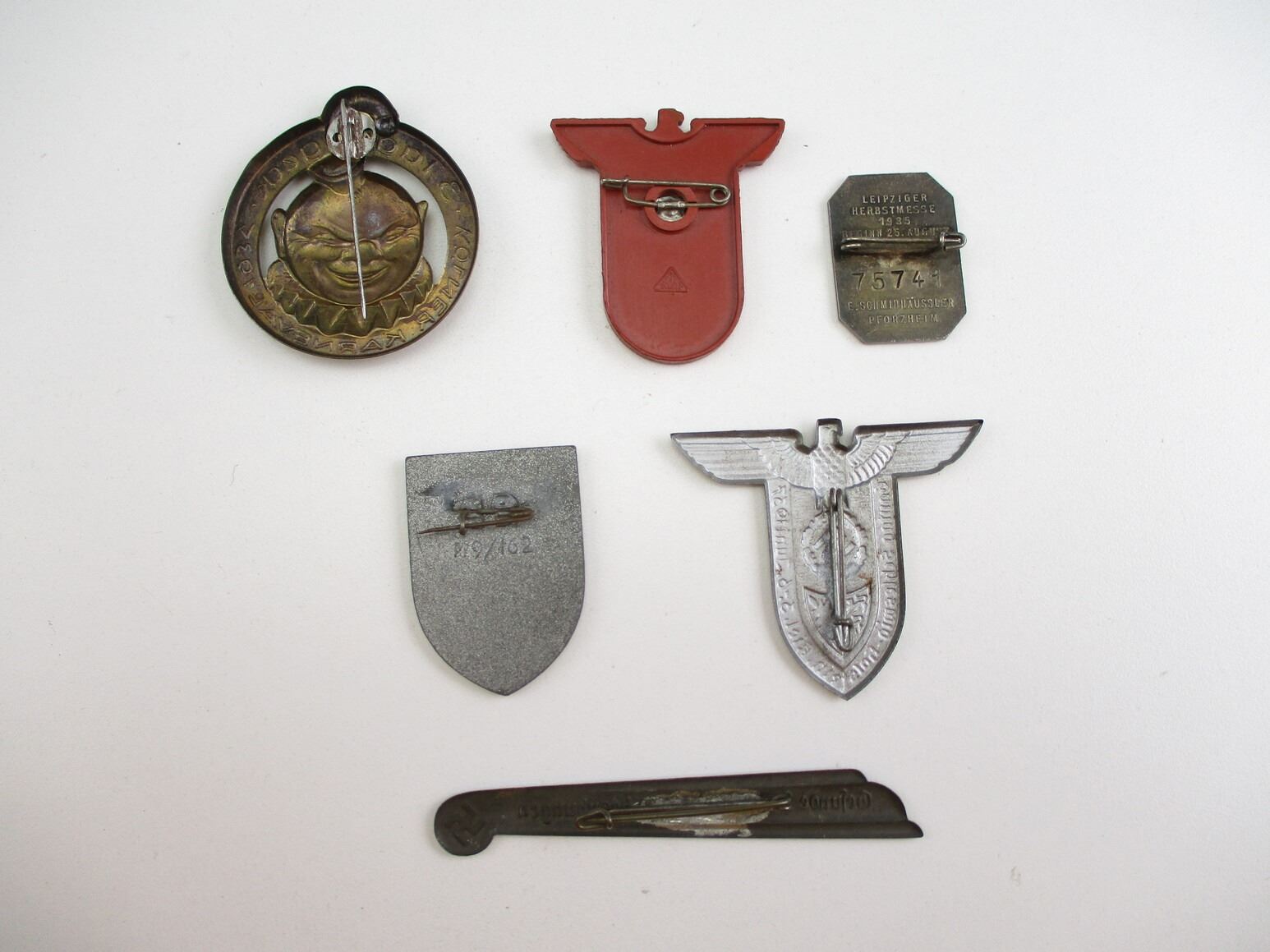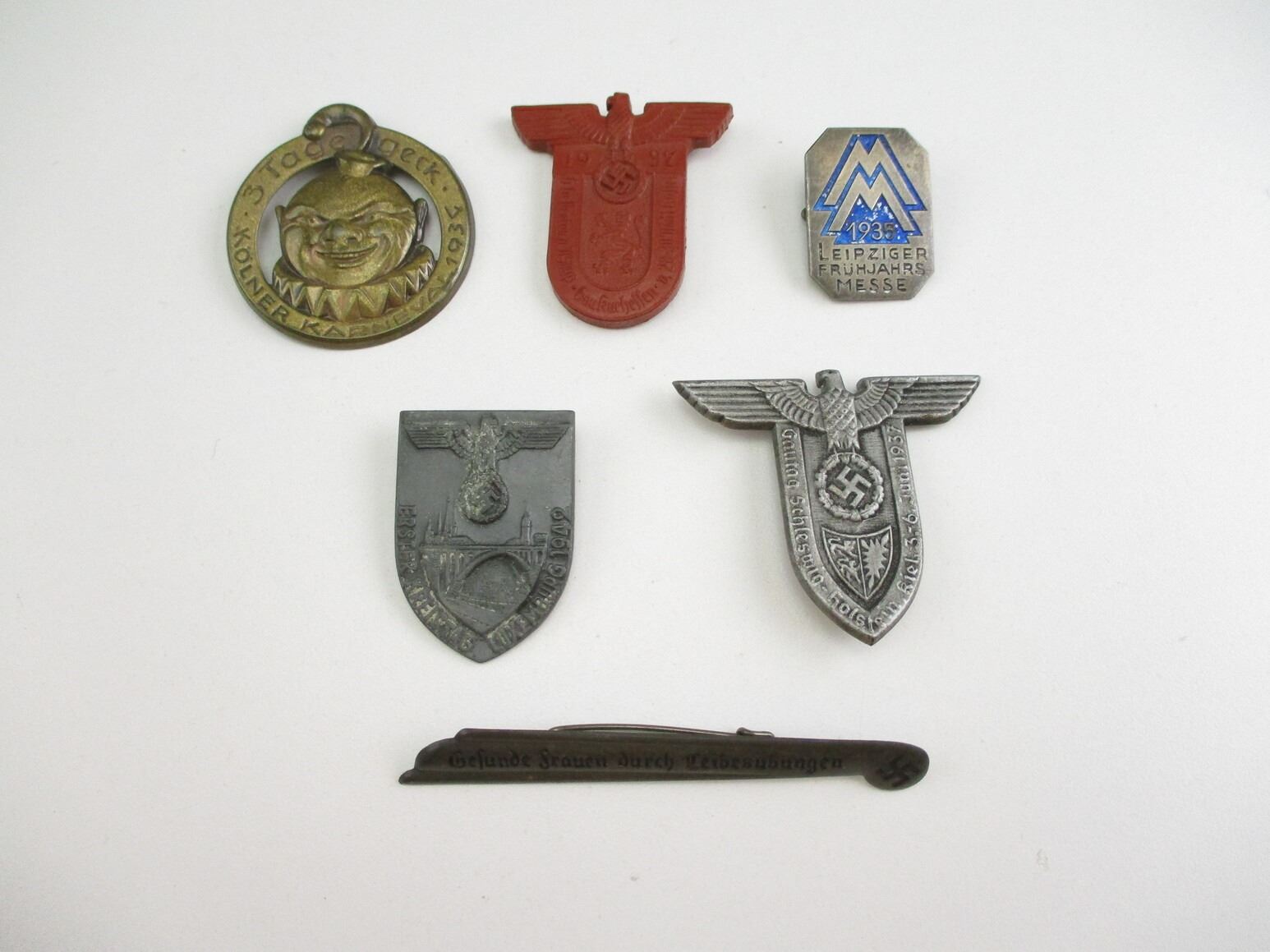 PRE-WAR / WWII GERMAN NSDAP TINNY LOT, LOT INCLUDES; (1) KOLNER KARNEVAL 1934, (1) LEIPZIGER FRUHJAHRS MESSE 1935, (1) GEFUNDE FRAUEN DURCH LEIBESUBUNGEN, (1) GAUTAG SCHLESWIG-HOLSTEIN 1937, (1) KASSEL NSDAP 1937 & (1) LEUXENBURG 1942, CONSIGNOR STATES: "100% GUARANTEED ORIGINAL". SEE PHOTOS.