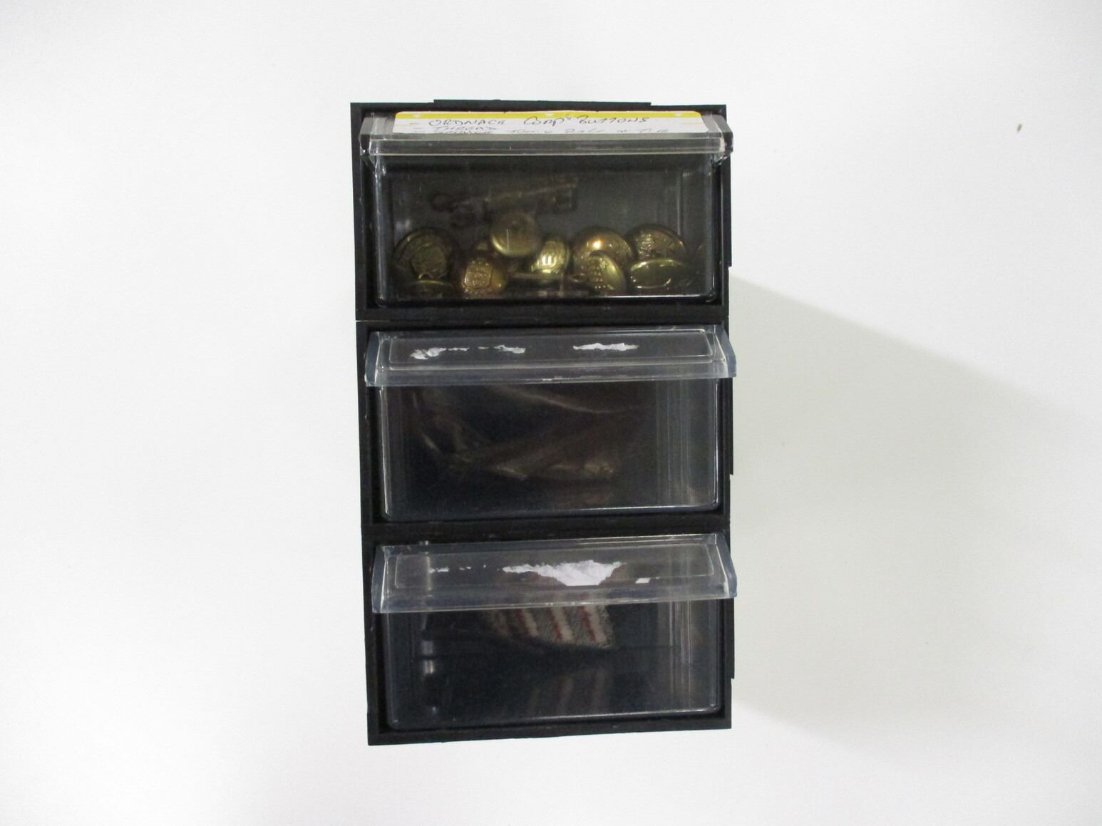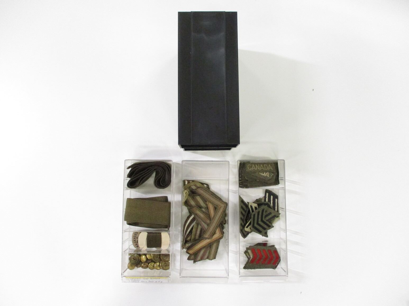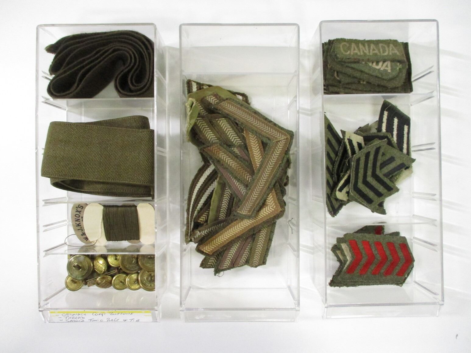WWII/ POSTWAR BADGES, BUTTONS, ETC. LOT, APPROX. (49) ITEMS INCLUDING; SERVICE BELT AND TIE, RCOC BUTTON, VARIOUS RANK CHEVRONS, RED AND WHITE, BLACK SERVICE CHEVRONS , VARIOUS YEARS OF SERVICE. LOT ALSO INCLUDES (1) JOBMATE PLASTIC, 3 UTILITY DRAWER STORAGE CONTAINER SET. MEASURES APPROX. 9.75" L X 4.5" W X 7.5" H.