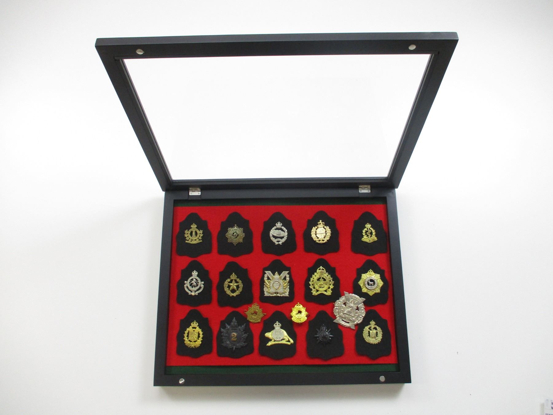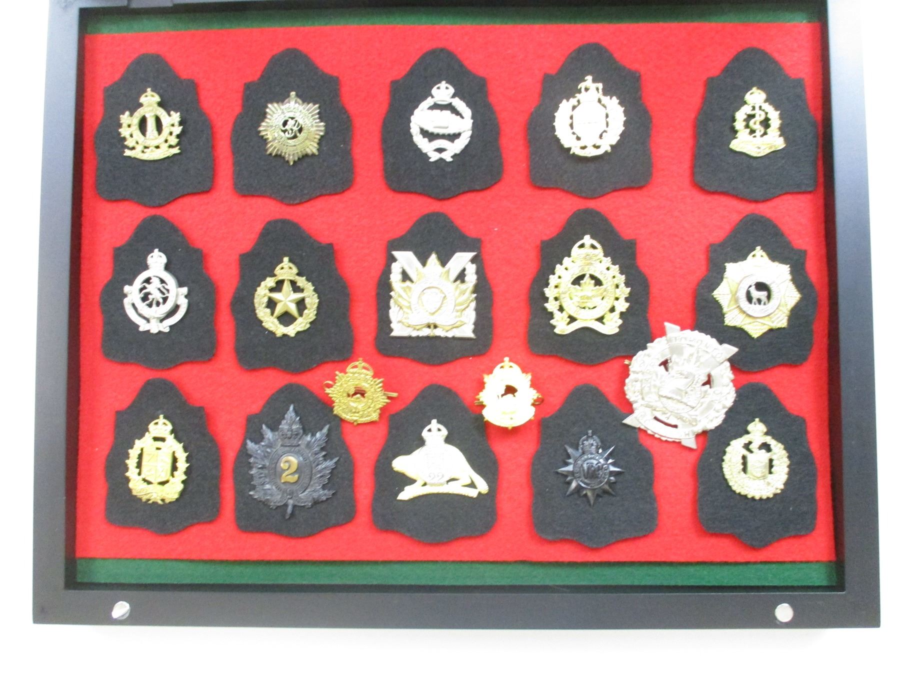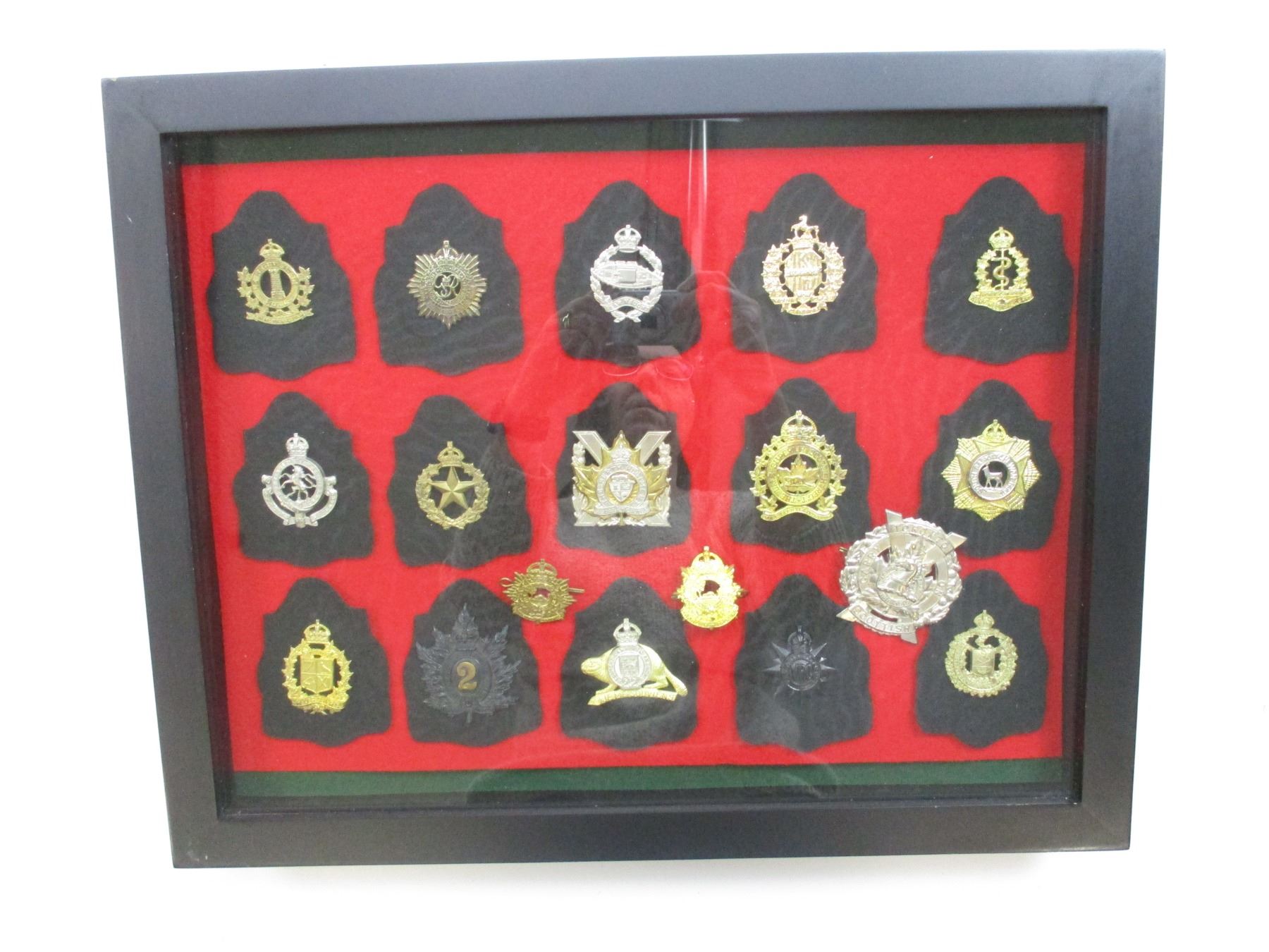 WWII ERA CANADIAN MILITARY BADGE LOT, (18) BADGES INCLUDING; REGIMENT DE HULL, RCASC, RCAMC, PERTH REGIMENT, LAKE SUPERIOR REGIMENT, SOUTH SASKATCHEWAN REGIMENT, QUEENS OF RIFLES, ROYAL 22ND, STRATHCONA'S HORSE, ETC., CASE IS APPROX. 19.5" X 15.5" X 2". SEE PHOTOS. *NO GUARANTEE ON GLASS FOR SHIPPING*
